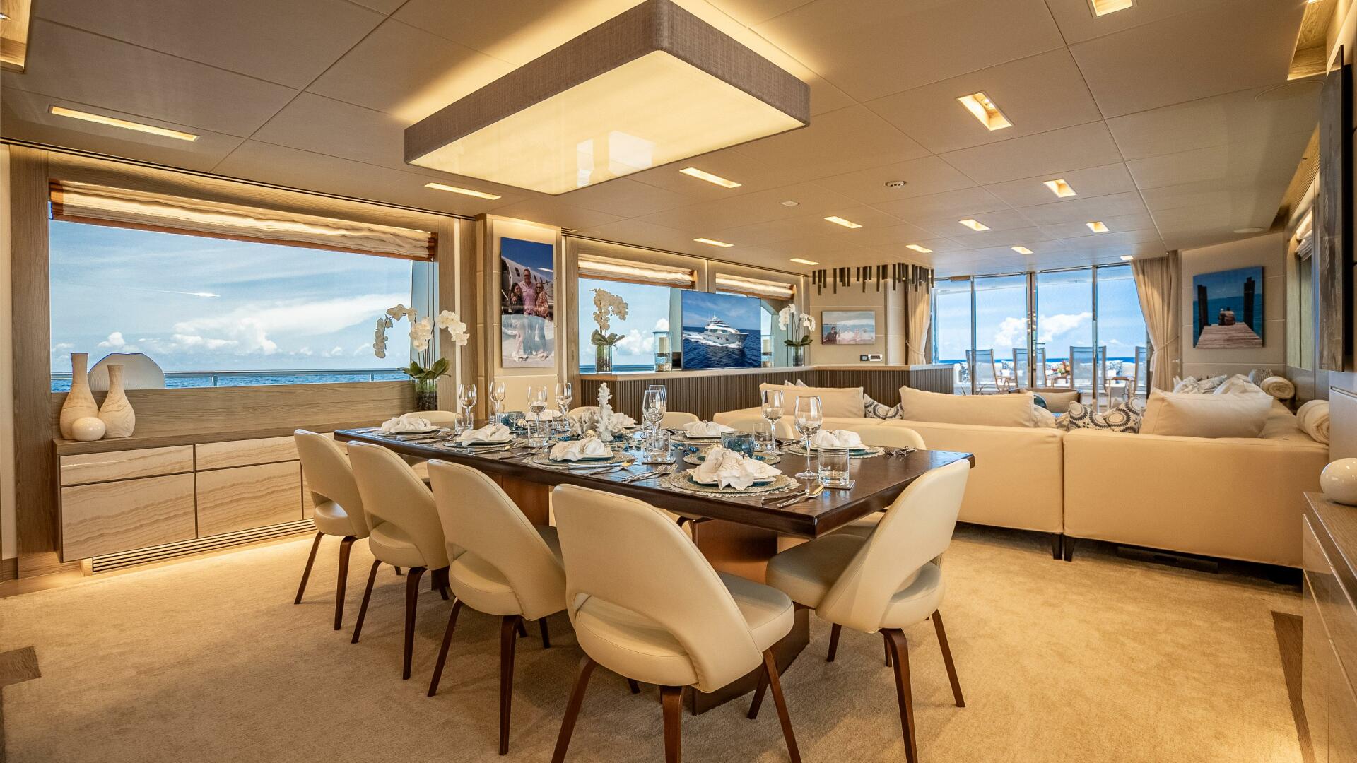 - Main Salon: A full-beam salon greets guests with plush seating, custom cabinetry, and panoramic windows. The open layout flows naturally into the formal dining area, accommodating up to ten guests.