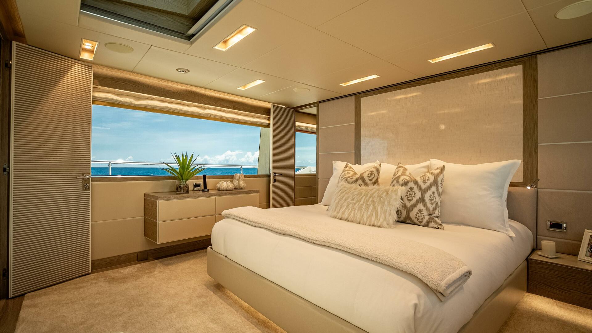 - Staterooms: Accommodations include a full-beam on-deck master suite with his-and-her en suites, along with four additional staterooms below deck, each with private baths. In total, the yacht comfortably sleeps up to 10 guests.