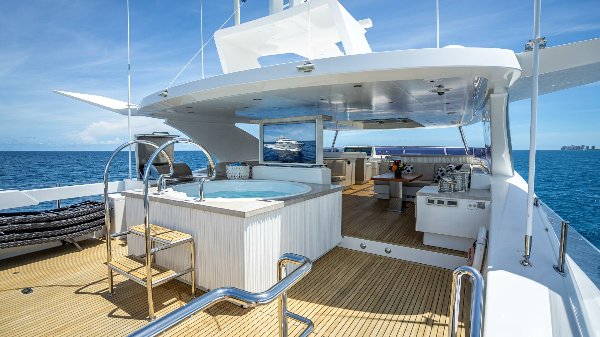 From her teak decking to polished stainless steel accents, the exterior of this Horizon 120 for sale is meticulously finished, reflecting the yacht’s pedigree.