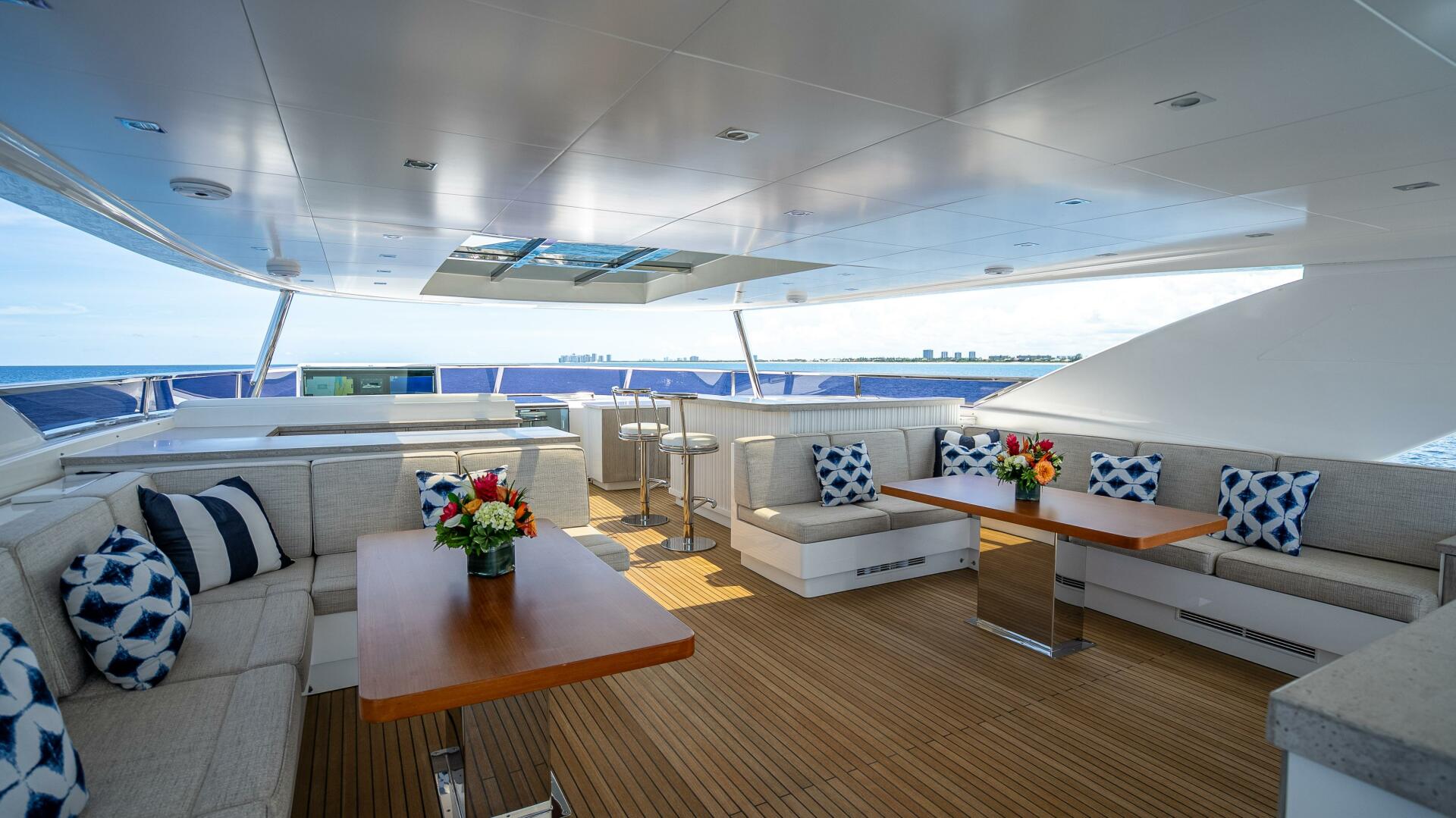 - Main Deck: The large back deck has outdoor dining and lounge seating. It connects to the main salon through sliding glass doors.