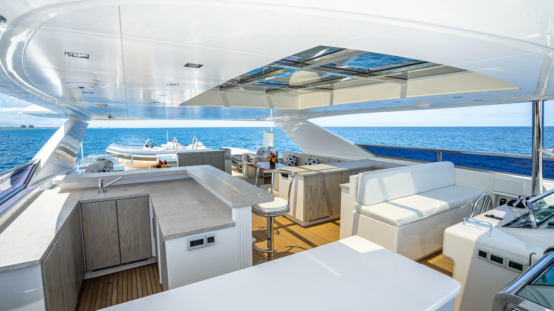 - Flybridge: The expansive flybridge is a highlight, boasting a hot tub, bar, dining table, and ample seating. Protected by a hardtop with an opening sunroof, it is an entertainer’s paradise.