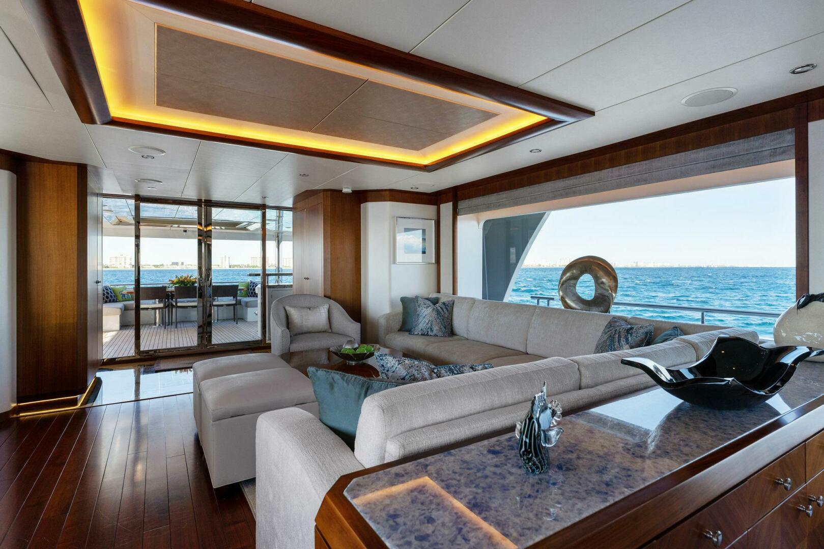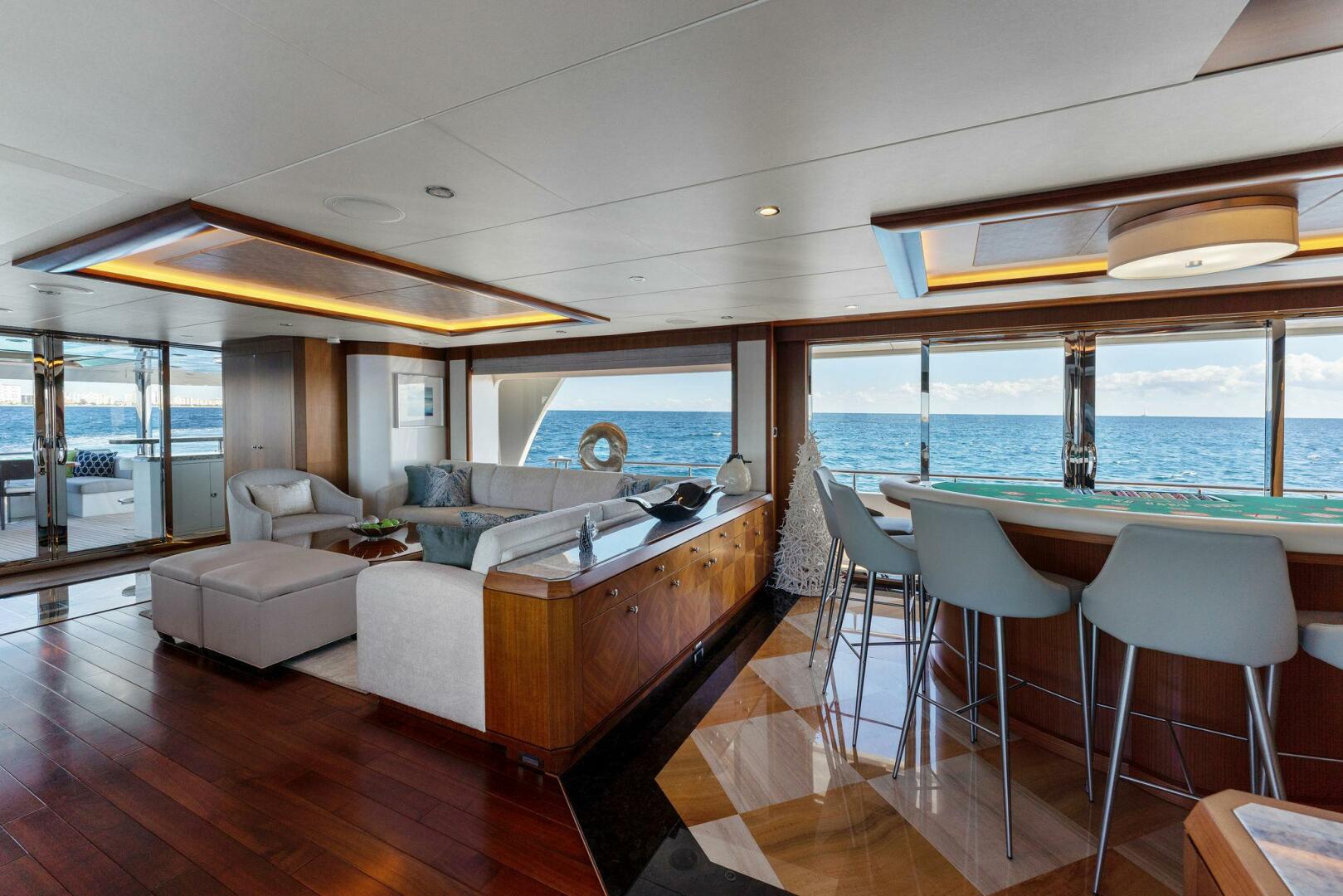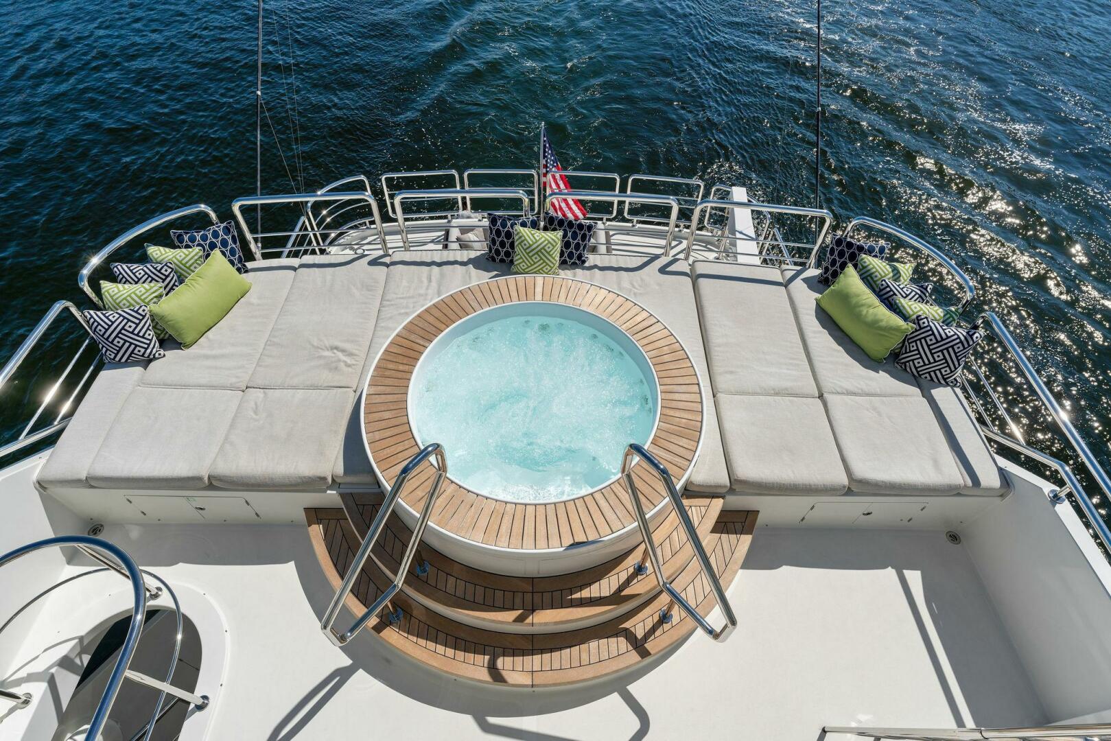 At the heart of the120 ocean alexander 2017 lies its crowning feature – a spacious sundeck that has been designed with leisure and relaxation in mind. This open space is lined with a nest of sun pads, providing the perfect spot to bask in the sun or enjoy a refreshing dip in the elevated spa pool. The design ensures that whether you’re in the water or lounging beside it, you’ll be able to enjoy the uninterrupted, panoramic views of the horizon. Adjacent to the pool area, you’ll find a fully equipped bar and a comfortable U-shaped sofa. This setup is perfect for entertaining guests or unwinding with a chilled beverage in hand. The sundeck on the OA 120 seamlessly blends comfort, luxury, and functionality, providing the perfect setting for memorable moments at sea.