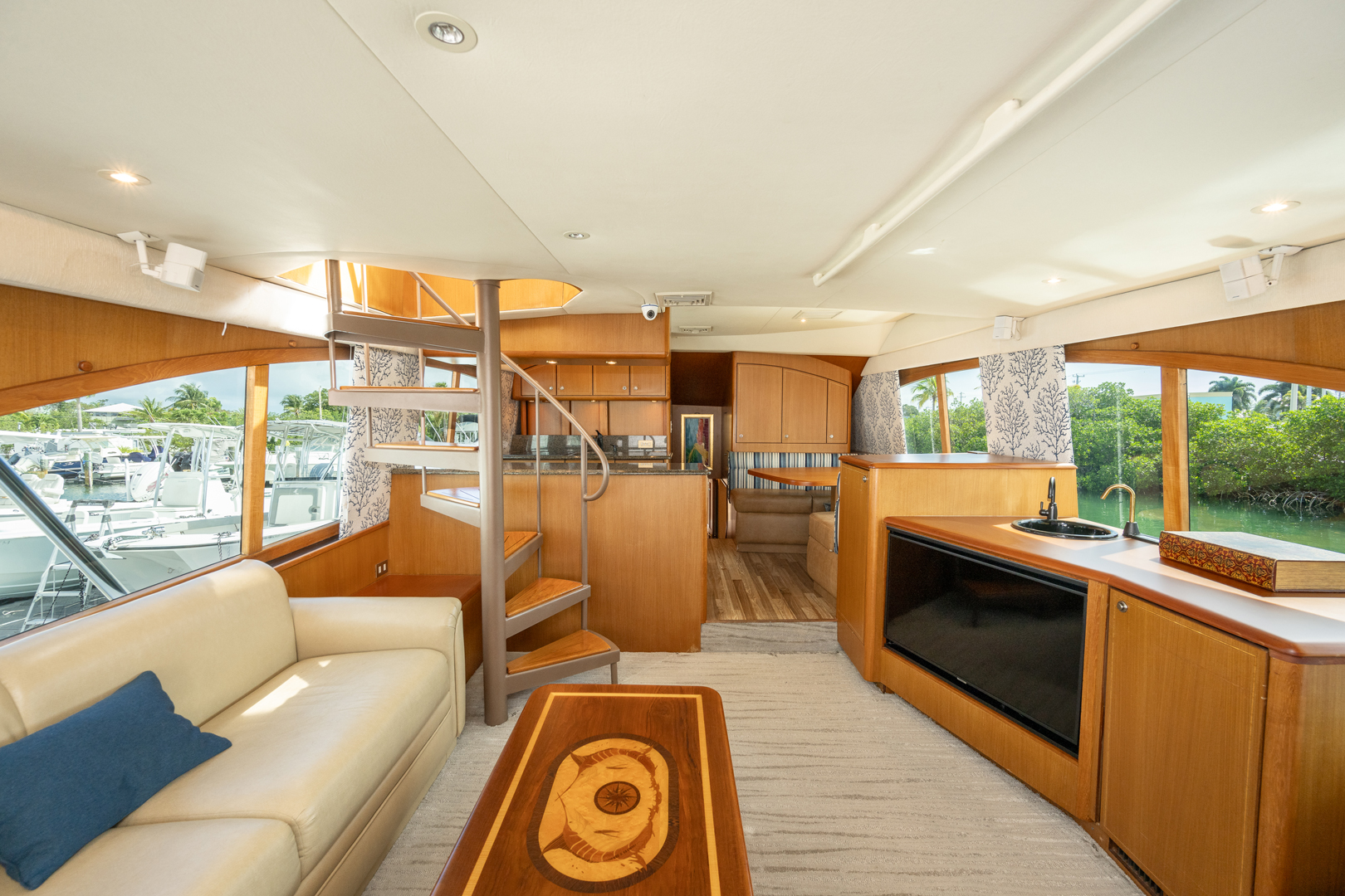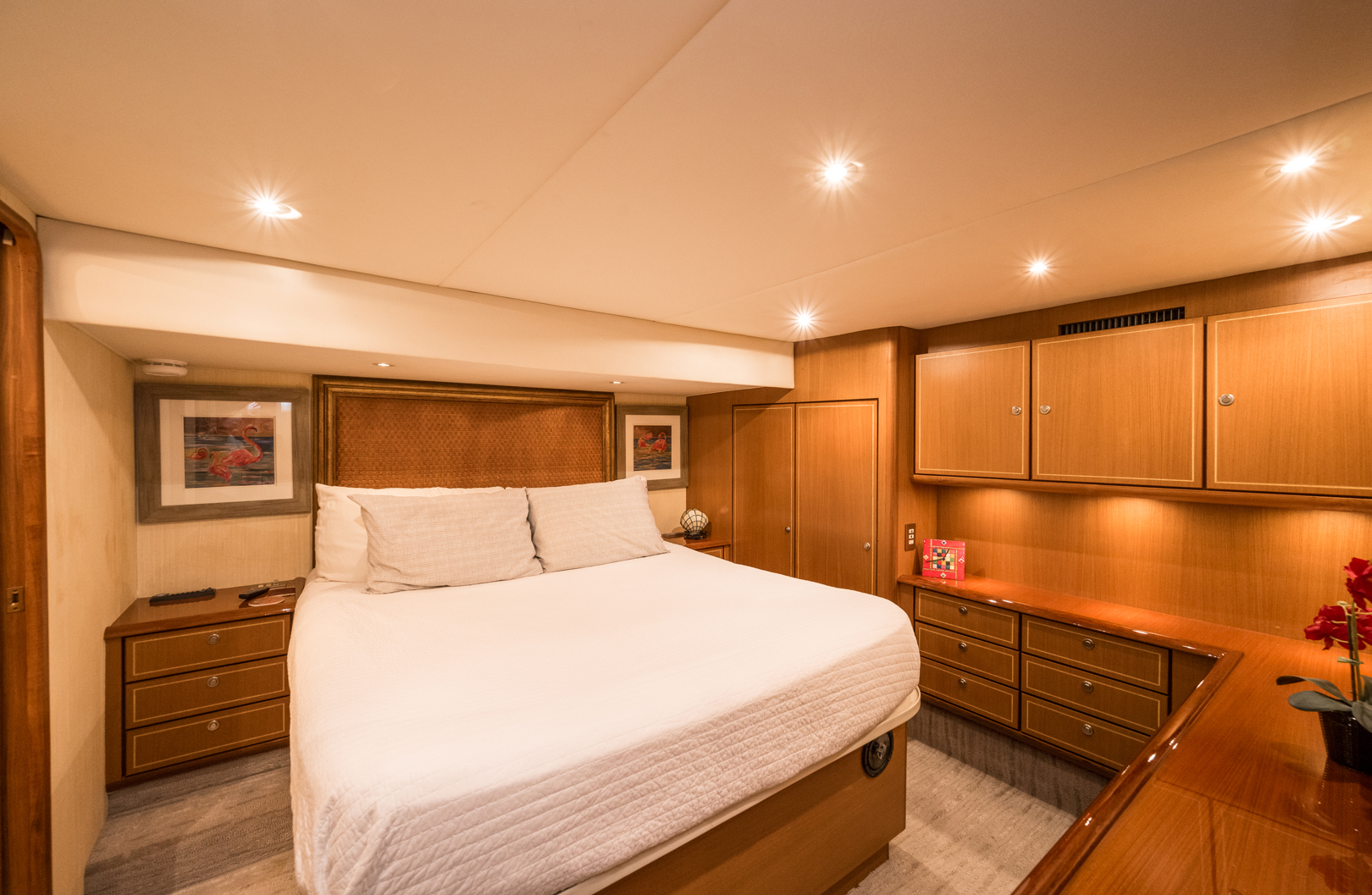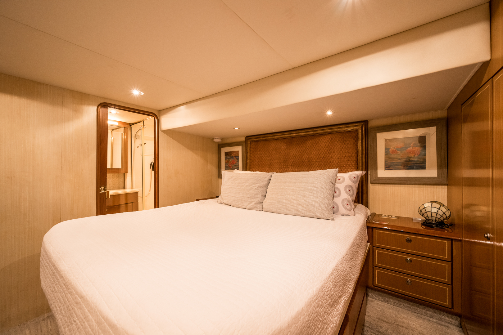 Unwind in Comfort: Accommodate up to 6 guests in the yacht’s 4 luxurious staterooms, each offering premium amenities. The master beam-to-beam suite provides a private haven, complete with a Queen bed and breathtaking views.