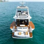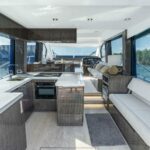 The award-winning 53 Galeon 2021 stands out as the most innovative yacht in its class. It boasts unique features such as the “beach mode,” which expands the cockpit width to an impressive 20 feet by lowering both the port and starboard coaming sides. The bow rest area features an expansive C-shape seating area, offering additional entertainment space. The spacious flybridge is equipped with a wet bar, sundecks, and a second helm station for easier maneuvering.