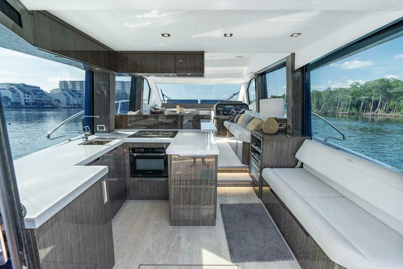The hydraulic swim platform is ideal for transporting various water paraphernalia. From the ample flybridge to the large staterooms, the Galeon 500 Fly is designed to please even the most demanding yacht enthusiasts while providing an awe-inspiring experience for family and friends. The main deck reveals closely linked saloon and cockpit areas with a flush floor and sliding side windows, creating a seamless indoor-outdoor living experience.