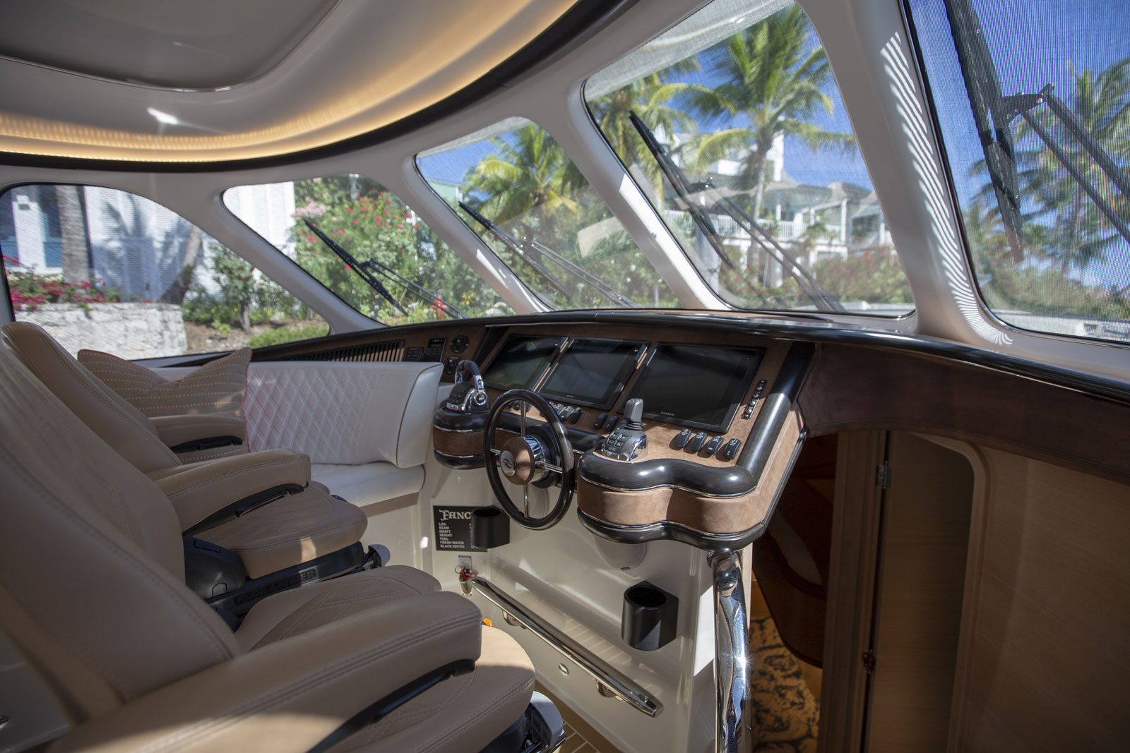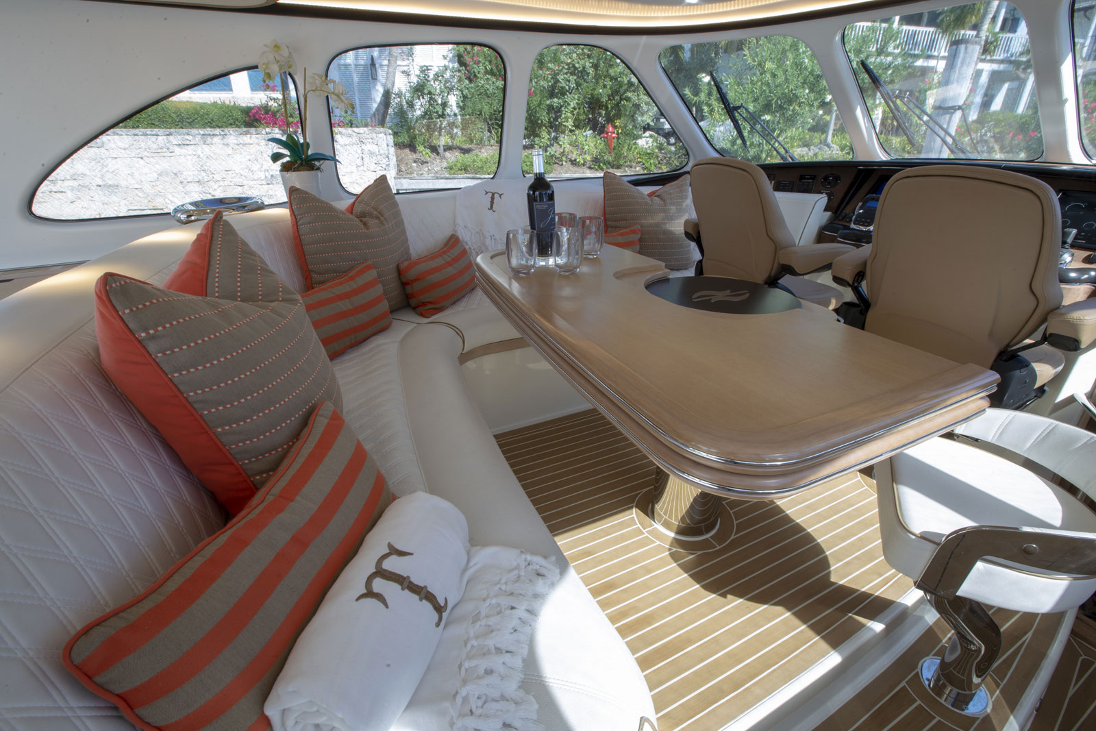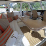 When you step inside, you will encounter elegance and luxury. The spacious dining area, seating eight and featuring beautiful teak floors, sets the stage for enjoyable gatherings. Modern amenities like intuitive IPS steering and Volvo Engine Controls make for a smooth sailing experience.