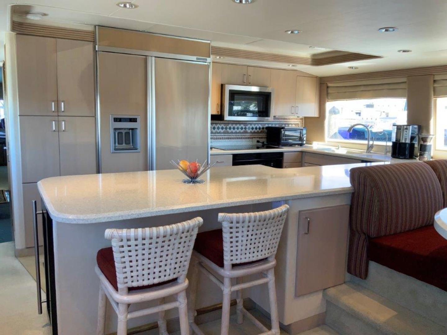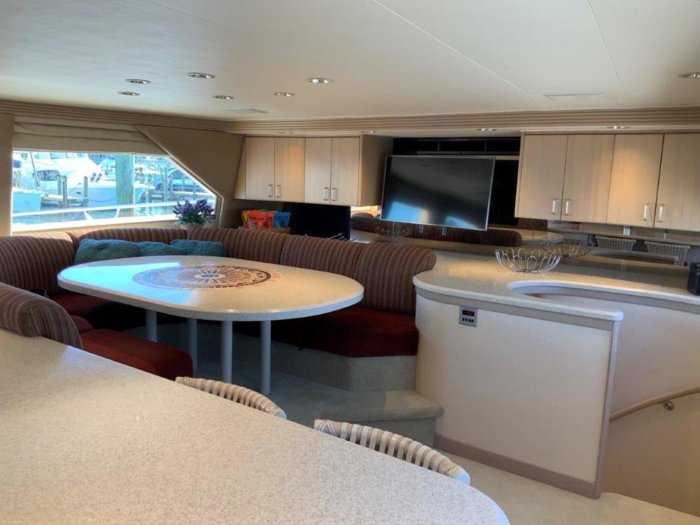 The country kitchen galley is forward with a raised dinette for panoramic visibility. Galley is U-shaped with Corian countertops. Located over the countertops adjacent to the eating area is an elevated television.