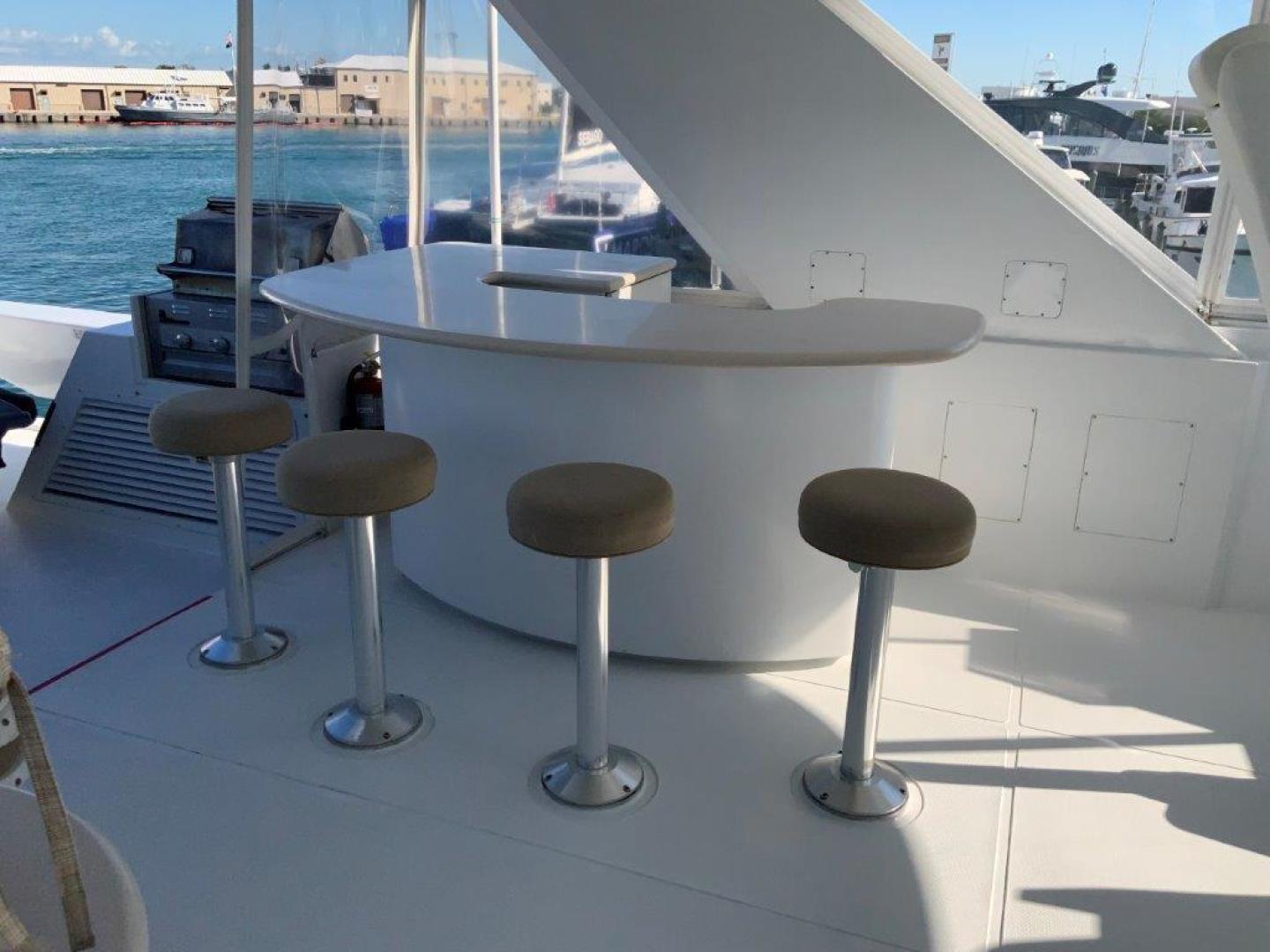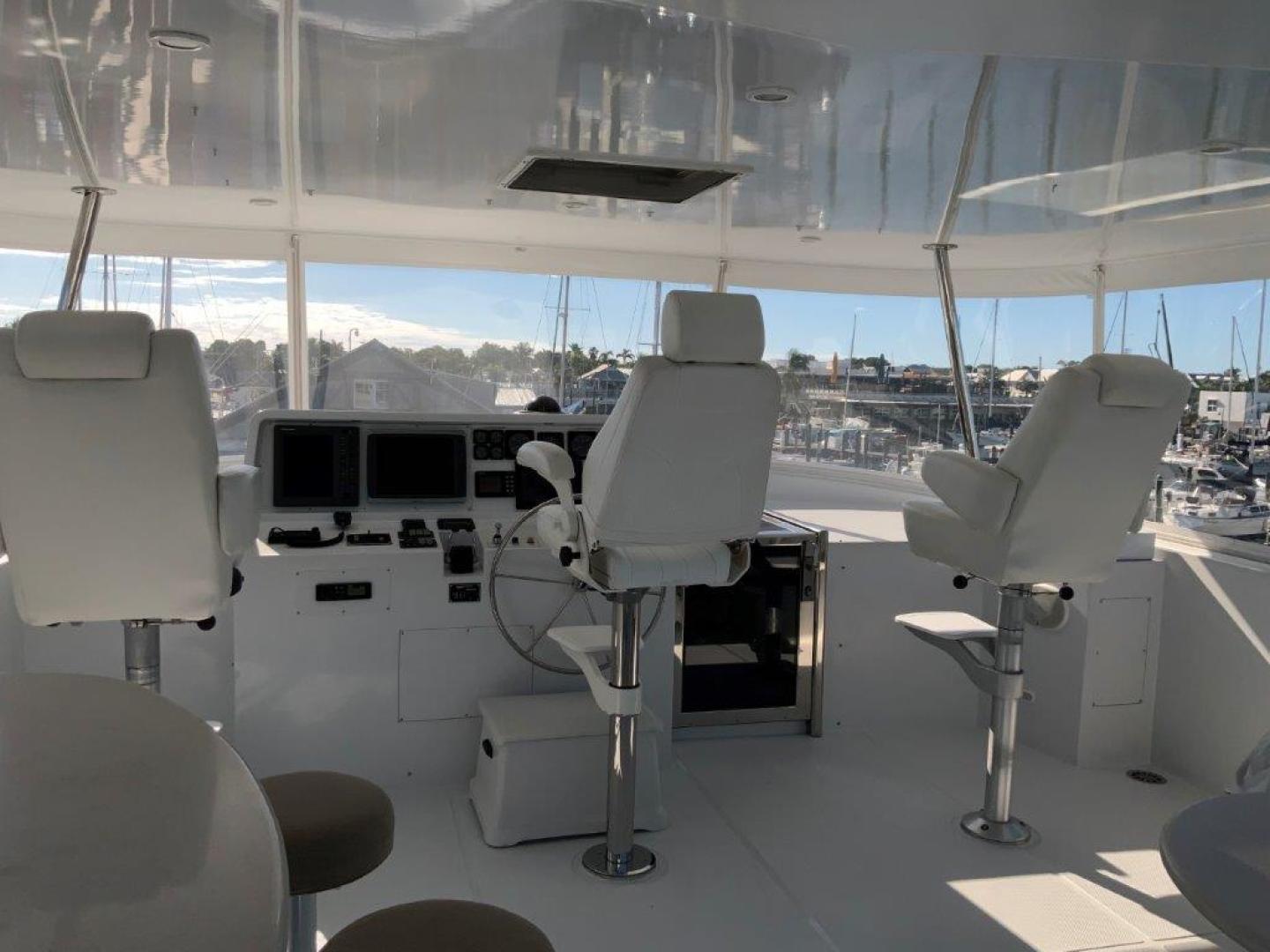 The large fly-bridge is accessed via a sliding door from the pilothouse or up the spiral staircase on the aft deck. The forward half of the fly-bridge is covered with a custom fiberglass hardtop with full Isinglass enclosure. Their is a L-shaped seating to Starboard, a walk behind bar with refrigeration and four bar-stools to port. Outside the enclosure you will find a stainless steel BBQ, The Nautica Catamaran tender, and additional space for a Waverunner if so desired.