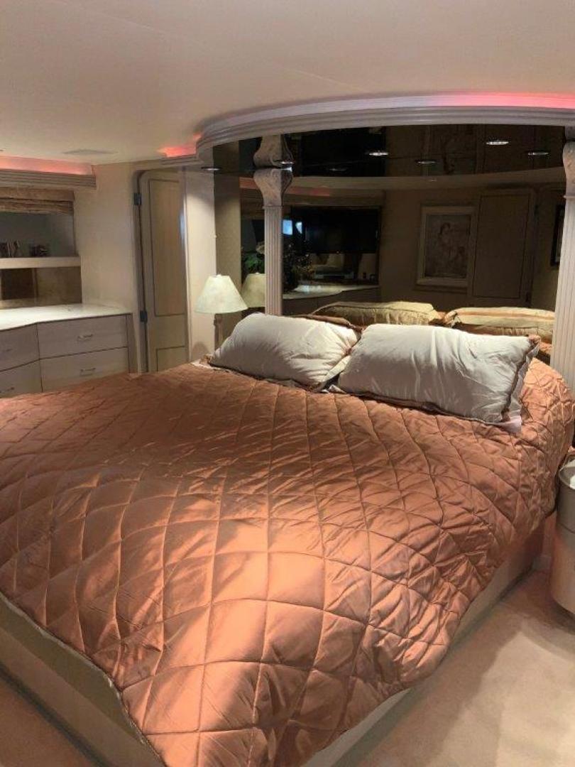 A foyer at the bottom of the stairs leads to two guest staterooms and master stateroom. Double doors lead to the beautifully appointed, full-beam, master stateroom. An elegant silk bedspread covers the oversized king berth with pillars on each side in front of the mirrored bulkhead behind the bed. Along with a built in love seat and vanity there is a full, walk-in closet, custom wall coverings and a full beam, and His & Hers head with over-sized Jacuzzi tub separating them. Being forward isolates the engine noise and makes the stateroom incredibly quiet.
