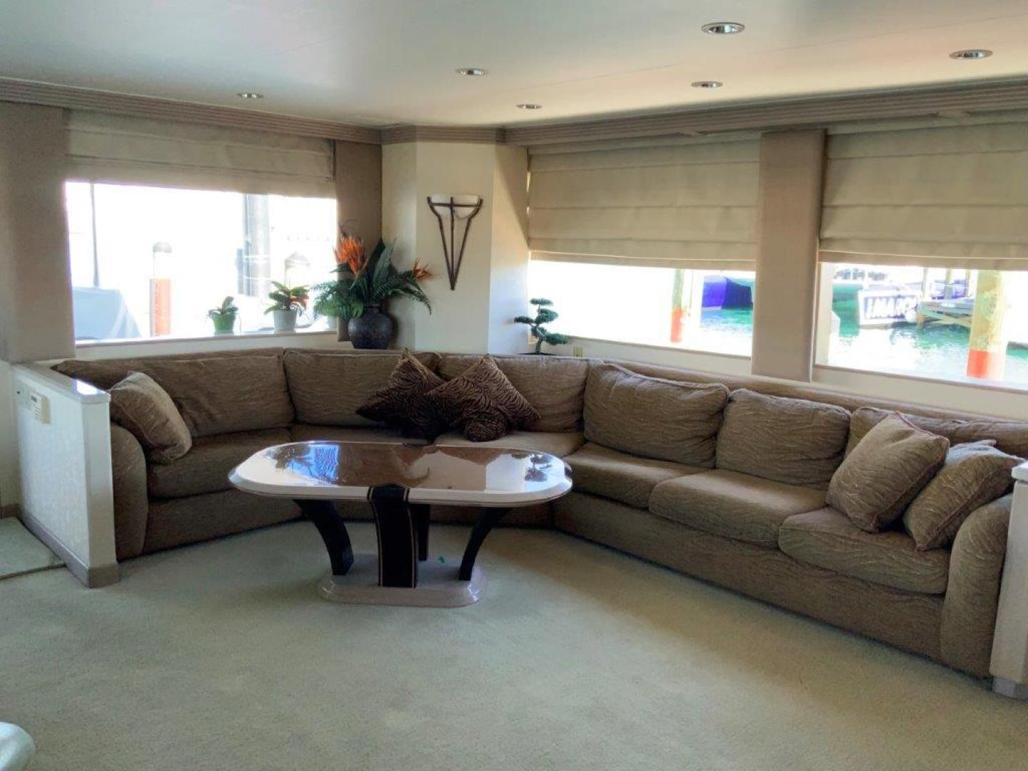 The main salon is accessed from the vast aft deck and you immediately feel the large expanse of the room which is affected by the 22′ 8″ beam and light, pickled ash wood. The main salon has a table and a custom inner-spring Chenille sofa. The custom step down bar with U-line ice maker and large bar refrigerator is the nicest of any West-ship on the water. The entertainment center has a large Samsung TV, hinged to access large liquor cabinet, a complete sound system is located at Starboard side of TV. All salon counter-tops are custom Corian. To the starboard side of the salon you will find a unique, custom table that doubles for cards or elegant dining for up to six people.