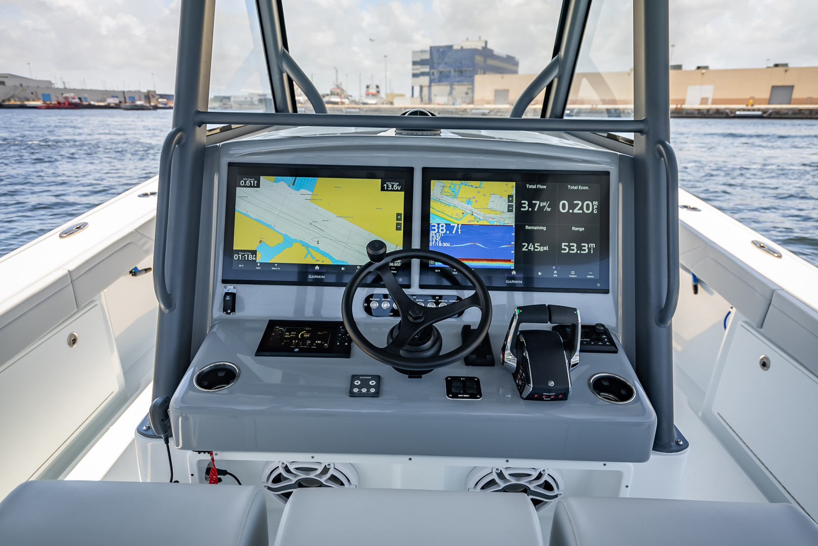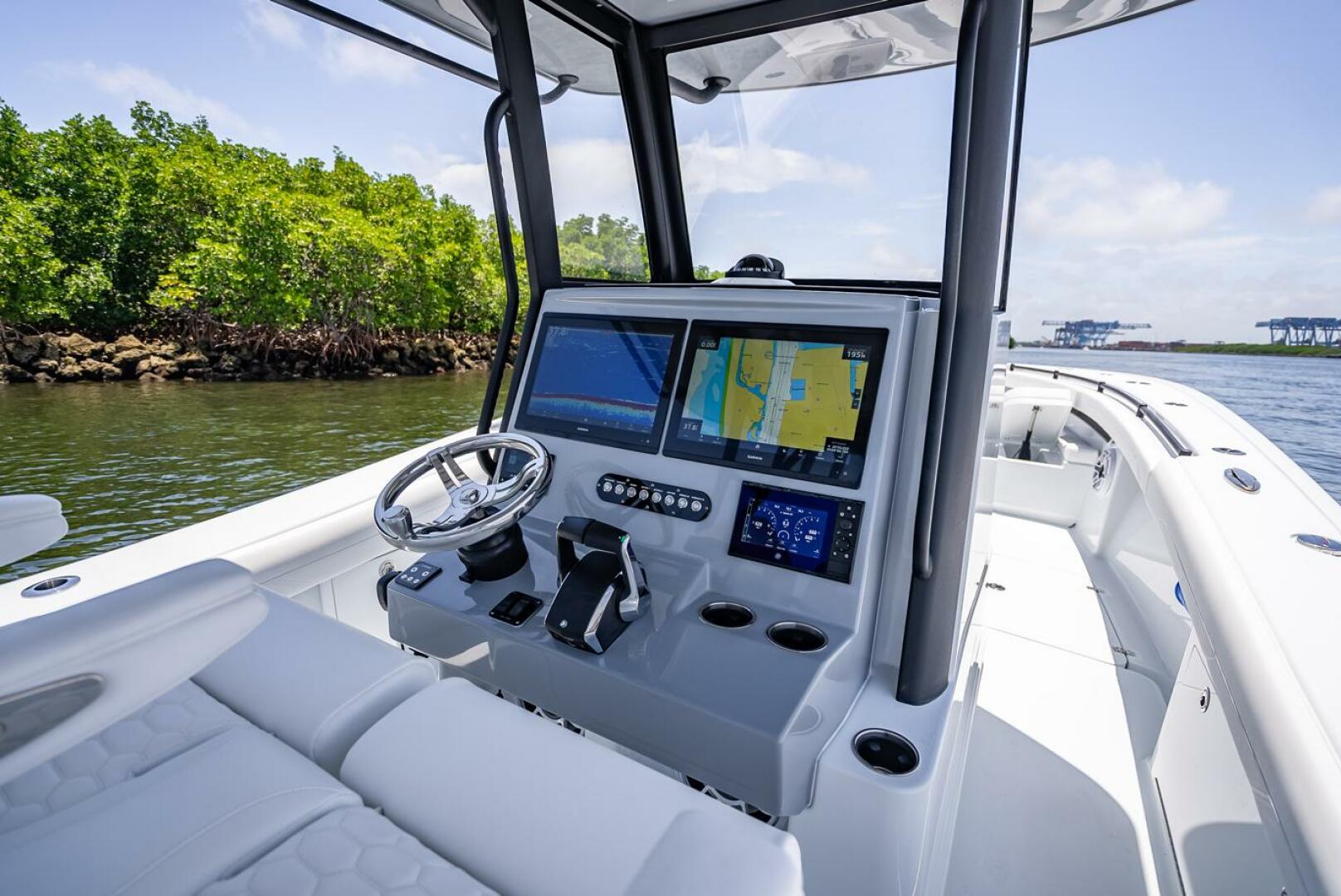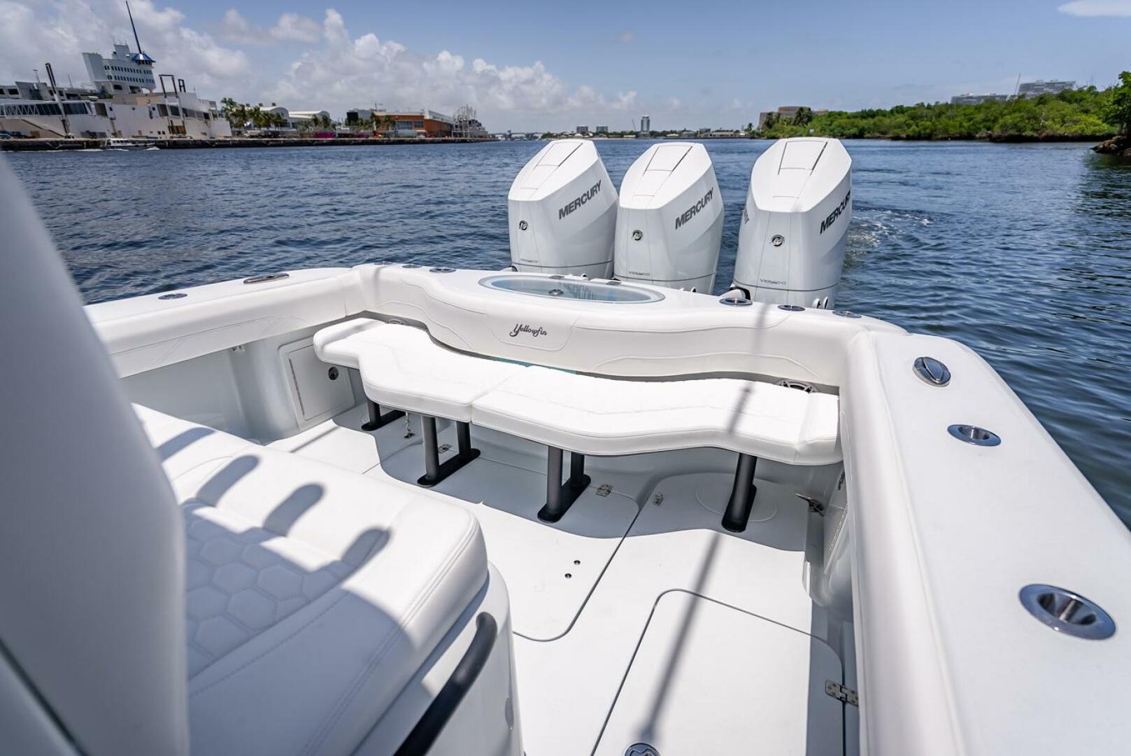 Comfort is of great importance for Yellowfin as well. This vessel features a bow thruster for easy maneuvering, a Mercury Vessel view 703 Display for monitoring engine performance, and comfortable seating with a triple headrest that make every trip more enjoyable. Garmin electronics provide comprehensive navigation and fish-finding capabilities, ensuring the boat is not only powerful but also highly functional.