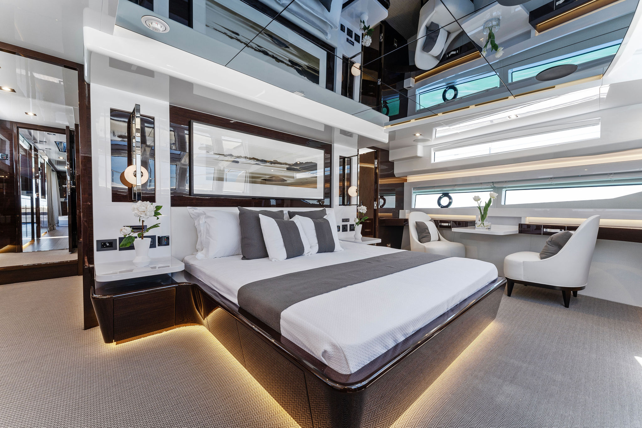 The interior of the 95 Pearl Yacht is just as impressive as the exterior. It features five staterooms, each with its own private bathroom. The master stateroom is located on the main deck and has a panoramic view of the ocean. The other four staterooms are located on the lower deck. Two of the 5 staterooms are VIP aft and the yacht is equipped with a converter for American or European power.