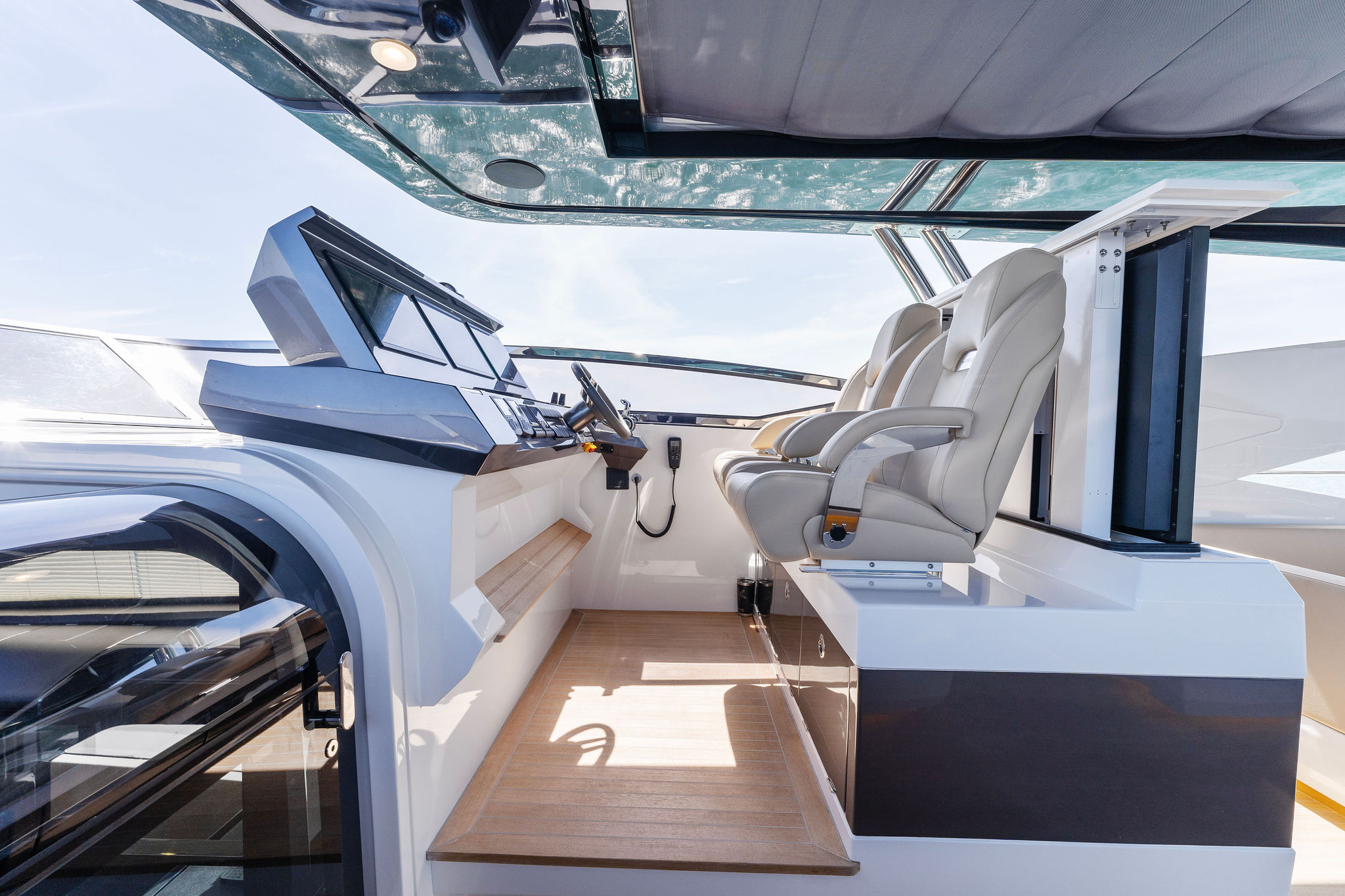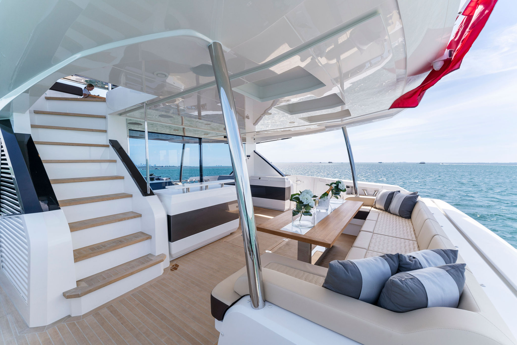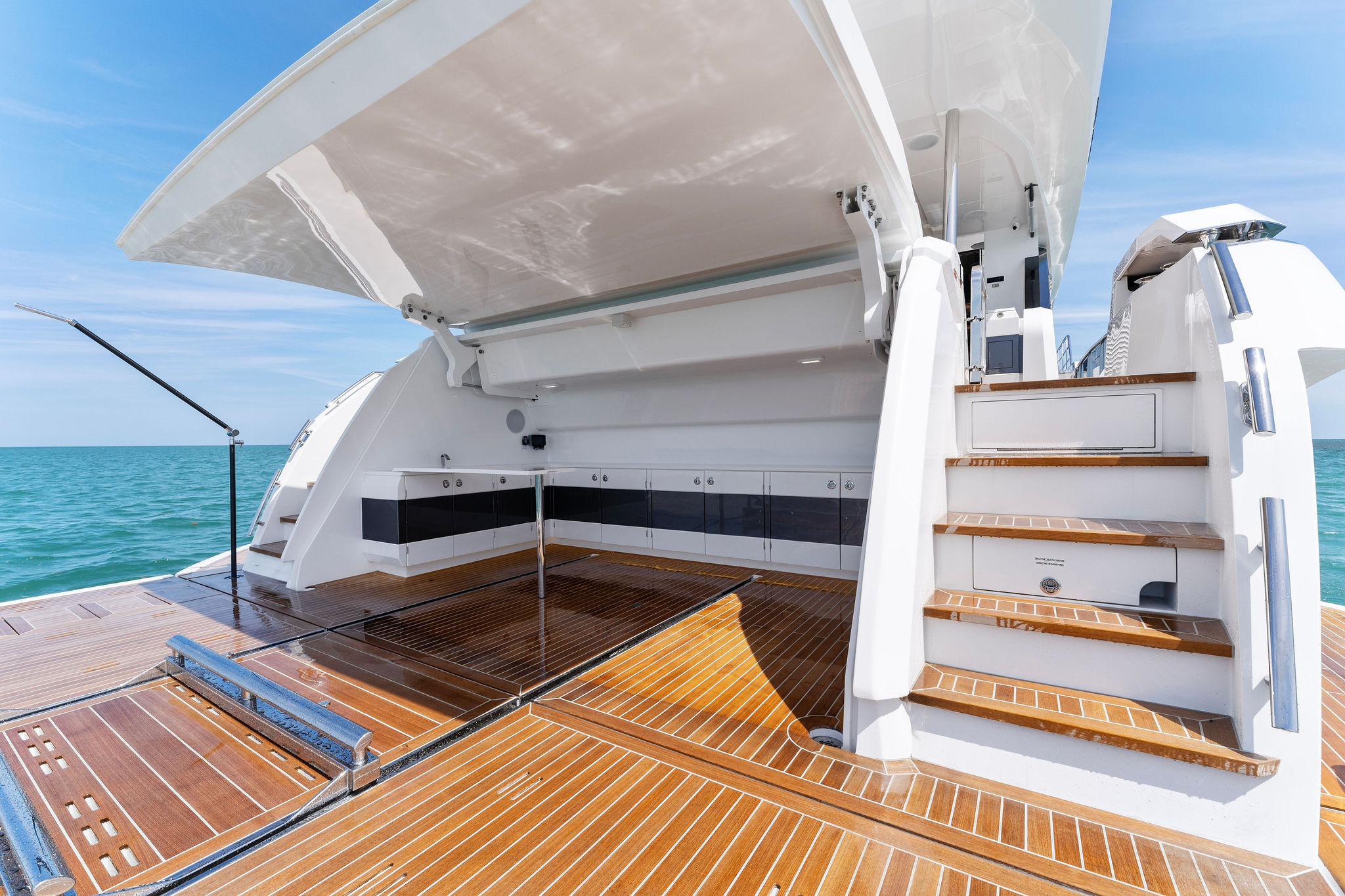 The 95 Pearl Yacht also has a spacious flybridge, which is the perfect place to relax and enjoy the views. The flybridge has multiple sunbathing areas. There is also a Hard top with an electric sunroof and a retractable flybridge aft sun awning. The beach club/garage is on the lower deck, which can be used to store water toys, jet ski or a tender.