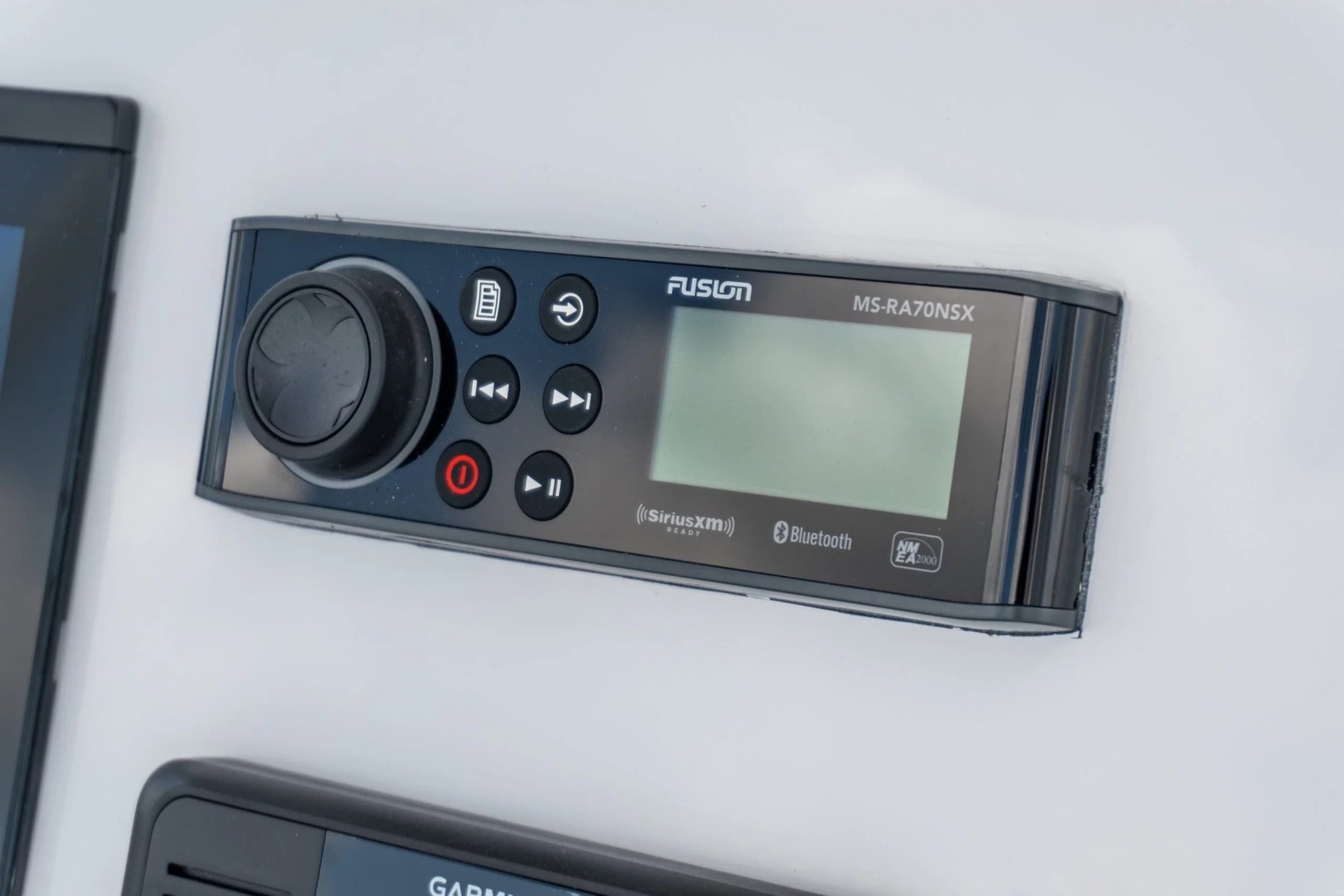 The practical simplified helm comes standard with a stainless steel steering wheel and rocker switches, but can be upgraded with a single or dual 12" Garmin display. A durable overhead pan top T-top provides protection and functionality with rod holders and lighting. This model comes standard with ample in-seat storage and integrated coolers that keep food and drinks cold.