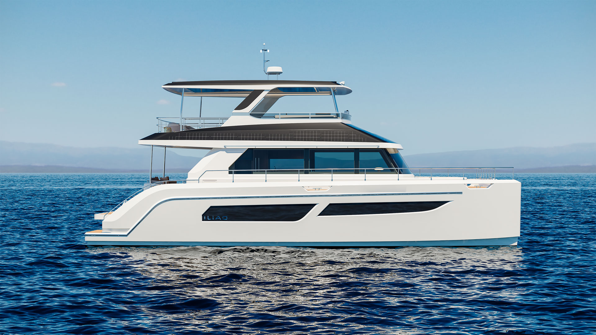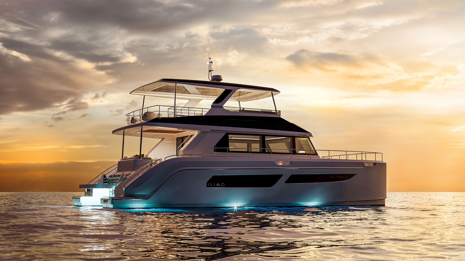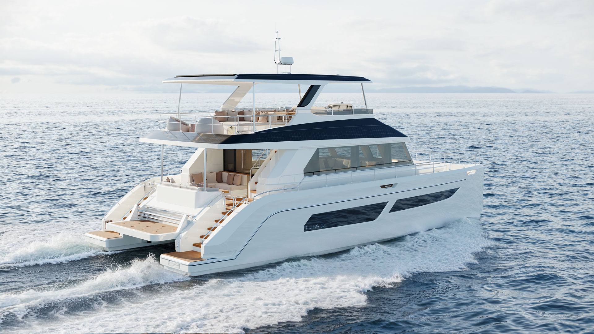 The new OffGrid Hybrid version elevates this legacy, incorporating a cutting-edge parallel hybrid propulsion system that allows seamless transition between traditional diesel power and silent, zero-emission electric cruising. Equipped with powerful Volvo D6 480HP engines, high-capacity lithium-ion batteries and integrated e-Motion generator functionality, the OffGrid Hybrid offers extended range and dramatically reduced CO₂ emissions while providing near-silent navigation. Its innovative design includes an extended carbon-fibre roofline fitted with a 5kW solar array and and 2.45kw of flexible solar panels custom fitted on the coachhouse roof to power all onboard systems and appliances. This enables sustainable energy generation and true off-grid capability, with house loads—including air conditioning—operating for more than 24 hours on battery power alone, and rapid recharging in under 30 minutes.