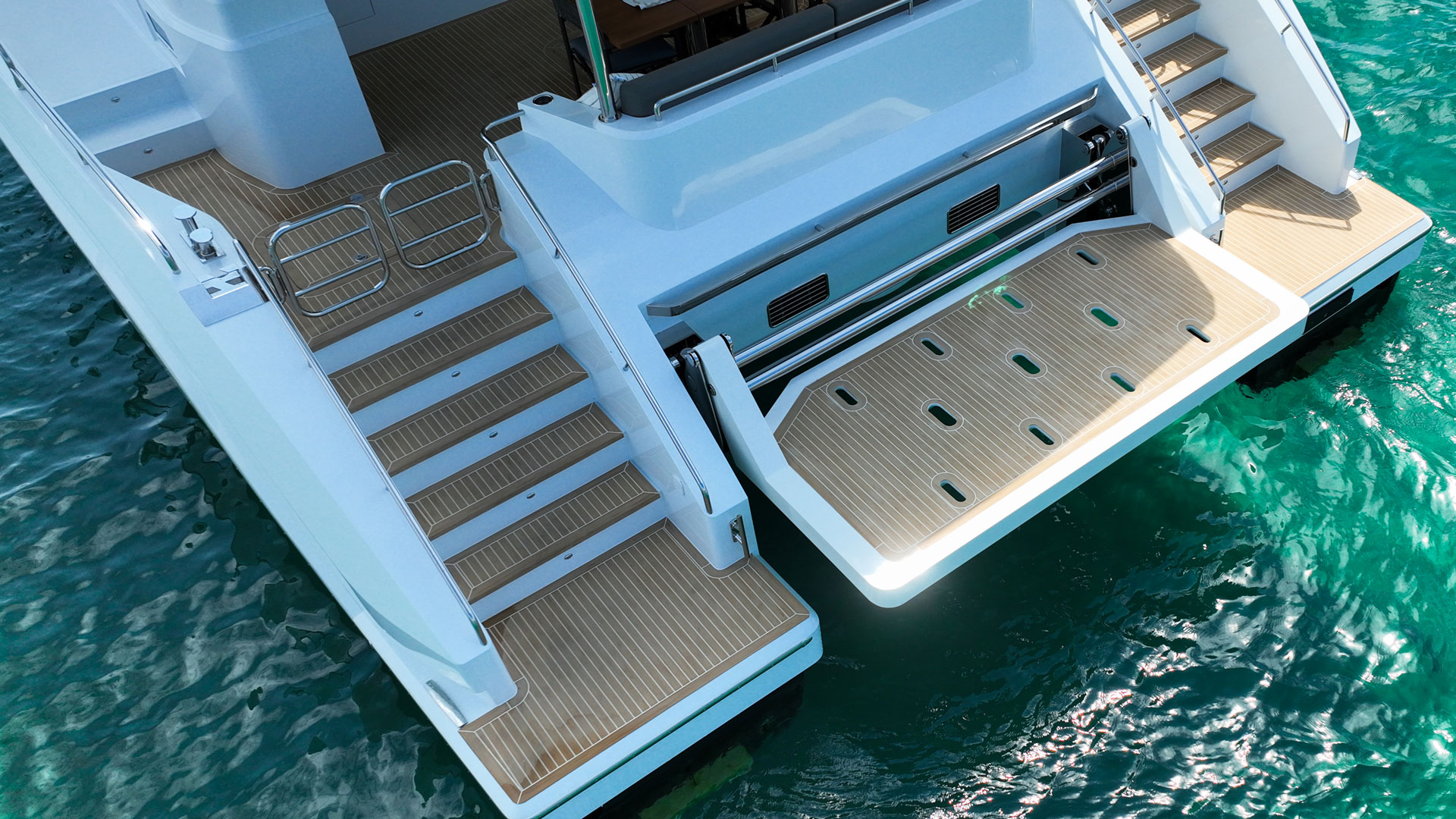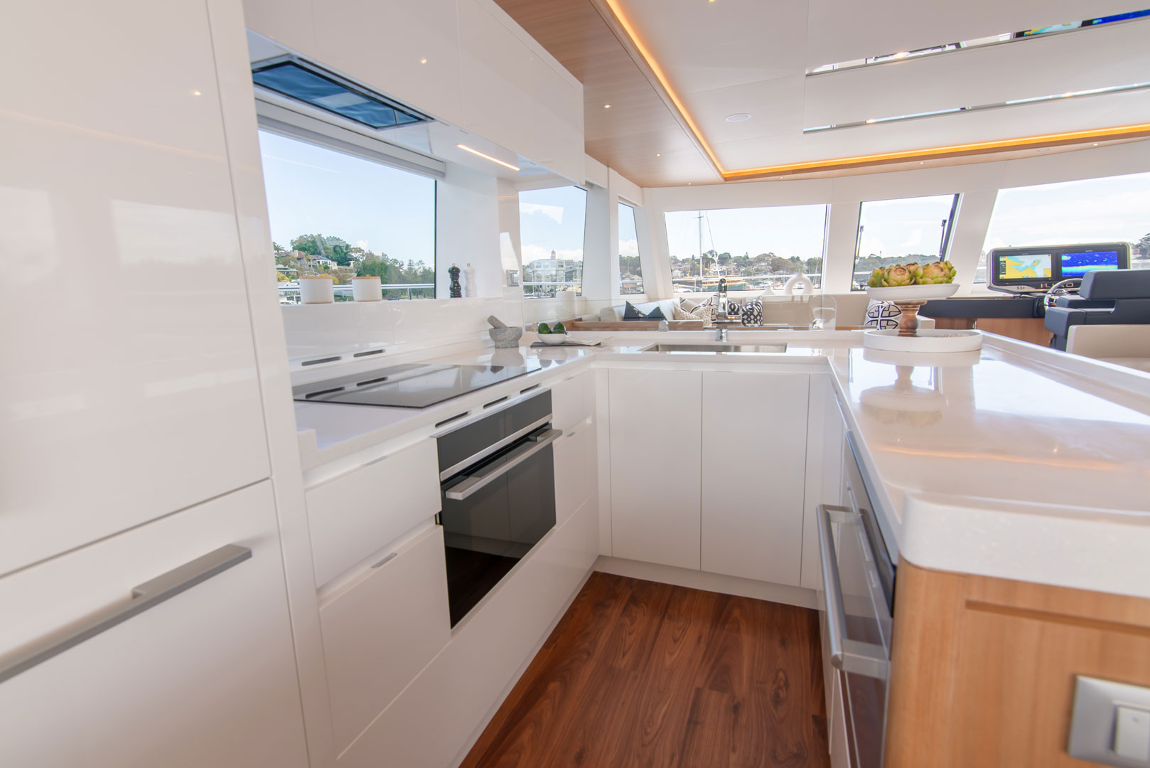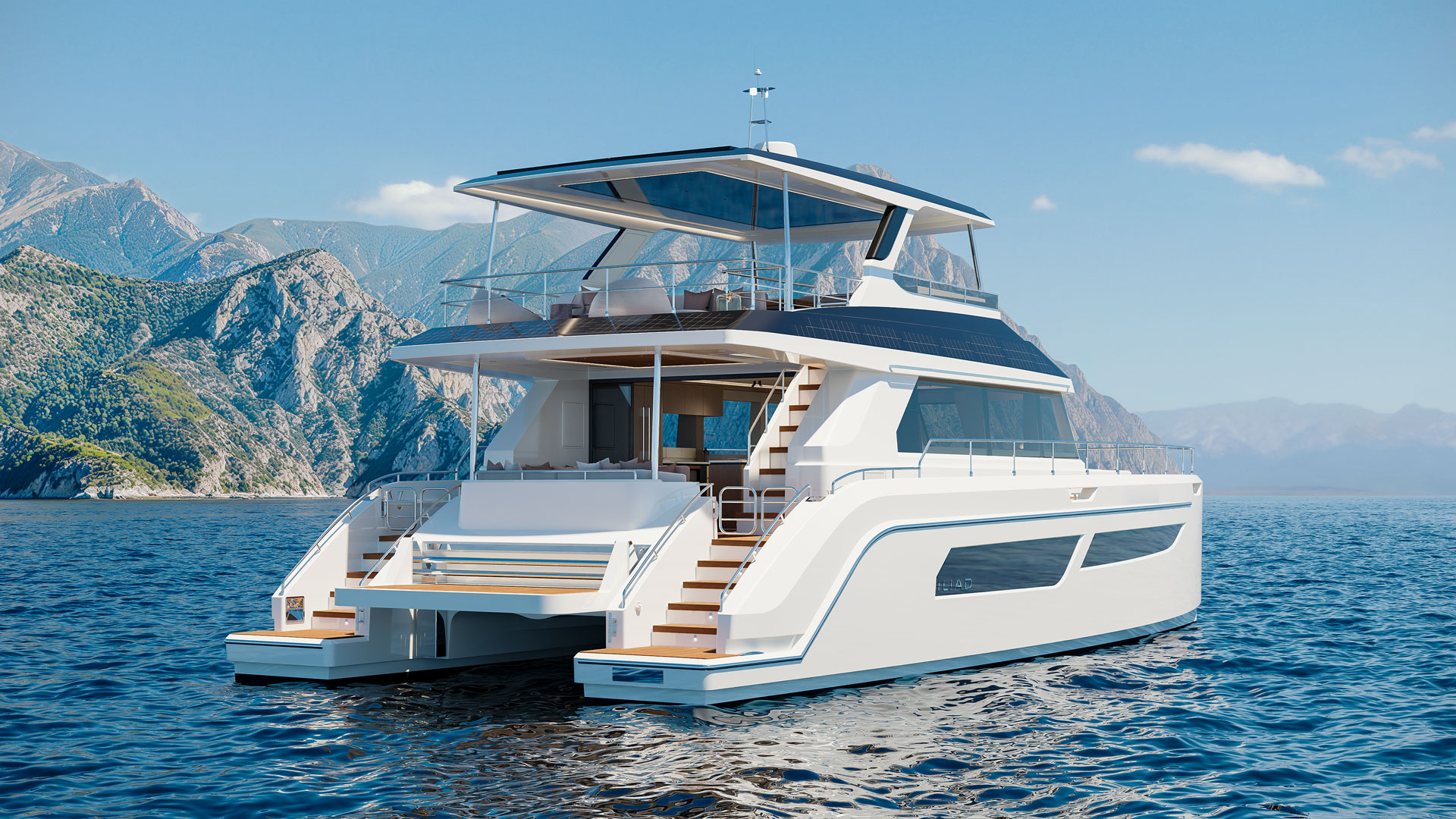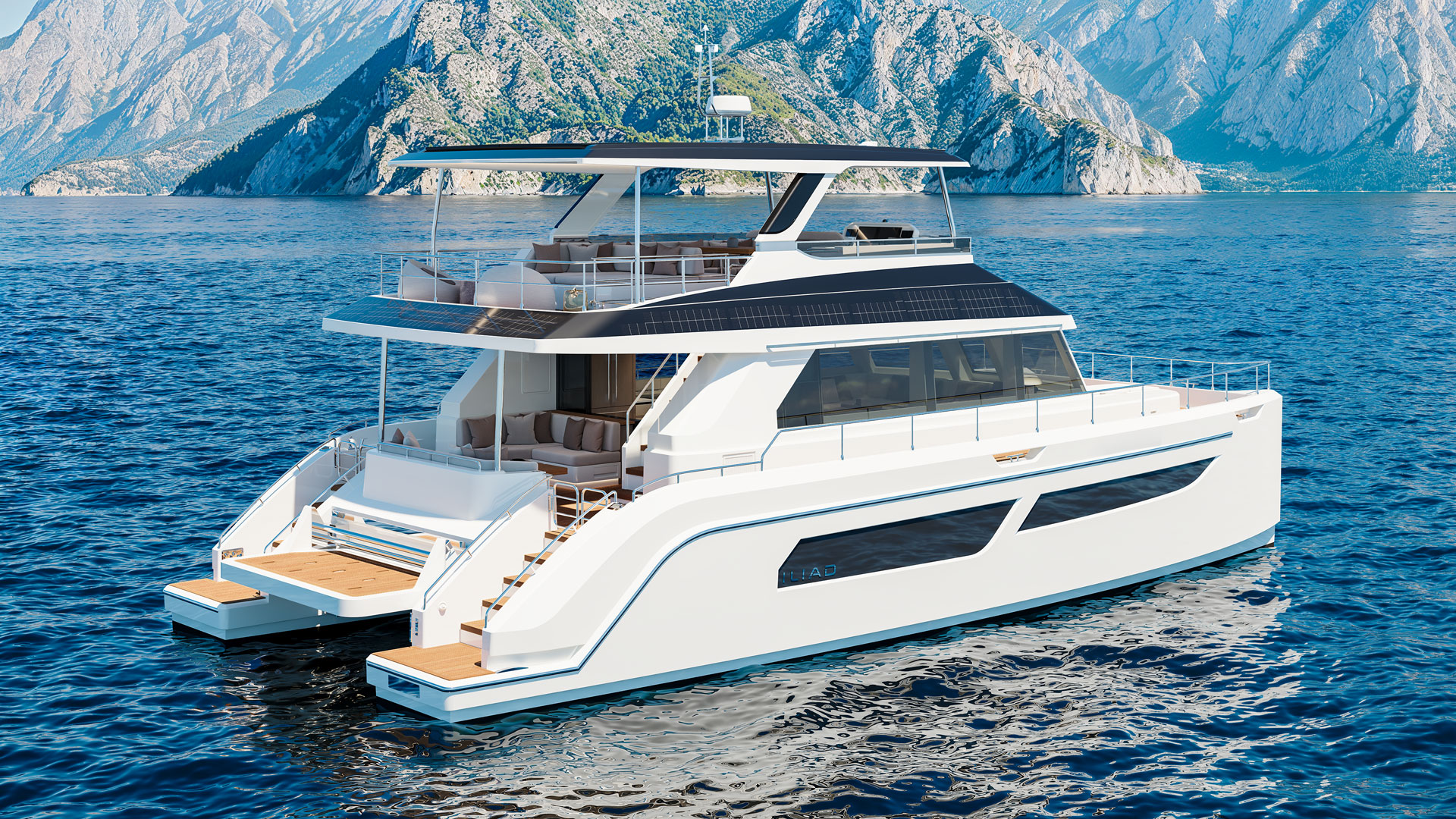 The new OffGrid Hybrid version elevates this legacy, incorporating a cutting-edge parallel hybrid propulsion system that allows seamless transition between traditional diesel power and silent, zero-emission electric cruising. Equipped with powerful Volvo D6 480HP engines, high-capacity lithium-ion batteries and integrated e-Motion generator functionality, the OffGrid Hybrid offers extended range and dramatically reduced CO₂ emissions while providing near-silent navigation. Its innovative design includes an extended carbon-fibre roofline fitted with a 5kW solar array and and 2.45kw of flexible solar panels custom fitted on the coachhouse roof to power all onboard systems and appliances. This enables sustainable energy generation and true off-grid capability, with house loads—including air conditioning—operating for more than 24 hours on battery power alone, and rapid recharging in under 30 minutes.