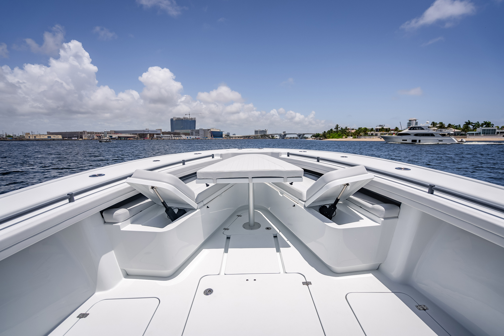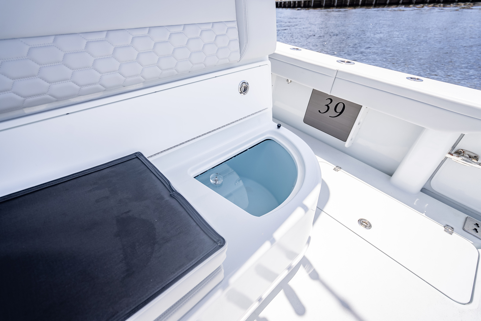 The deck layout is optimized for fishing, with 360-degree walkability and ample storage. A large cockpit area features multiple livewells, fish boxes, rod holders, and tackle storage. The bow has a sizable casting platform and additional seating. For comfort, the 39 includes a console with a cabin below, housing a berth, head, and sink.