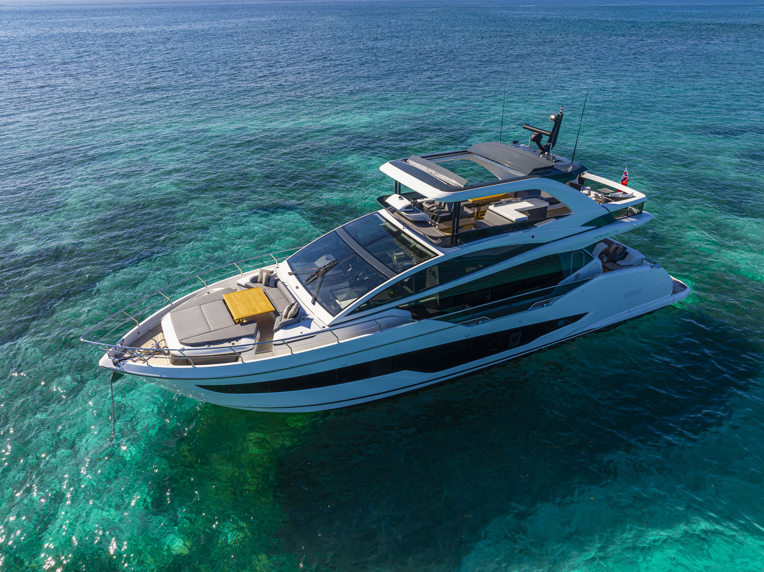 The Pearl 72’s generous spaces and exceptional garage for tender and jet ski storage provide an unmatched level of convenience and luxury. The main deck features the saloon, dining area, and galley, while the lower deck offers a private owner’s cabin and three guest cabins, all with en-suite facilities. The flybridge, accessed via a staircase from the saloon, offers a spacious sunbathing area, bar, and dining area, all with panoramic views.