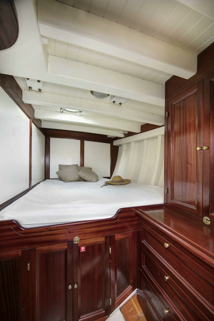 RIG & SAILSRigging: auric cutterMaterial of all spars: spruce, except Oregon pine for the lower mast Lower mast: 19.80mBoom mast: 7.20 m Boom: 16.20 mMainsail horn: 11.20 mBowsprit: 6.70m including 4.20m beyond the stem Boom: 9.50mBoom: 8 m Deck covering: teakBulkheads, companionway, hatches, fargue: mahogany SAILING :The total original sail area, as recorded in the Lloyd's Register, was 4448 square feet, or 413.23 m².Mainsail: 195 m² Boom sail: 56 m² Headsails : jib 47m² , gennaker (depending on cut 300 to 500m²), staysail 37m² , clin jib 45m² MACHINERY Engine: Yanmar 4JH4G 110 HP TANKAGE Fuel: 400 litres Water 350 litres- Instruments B&G H3000