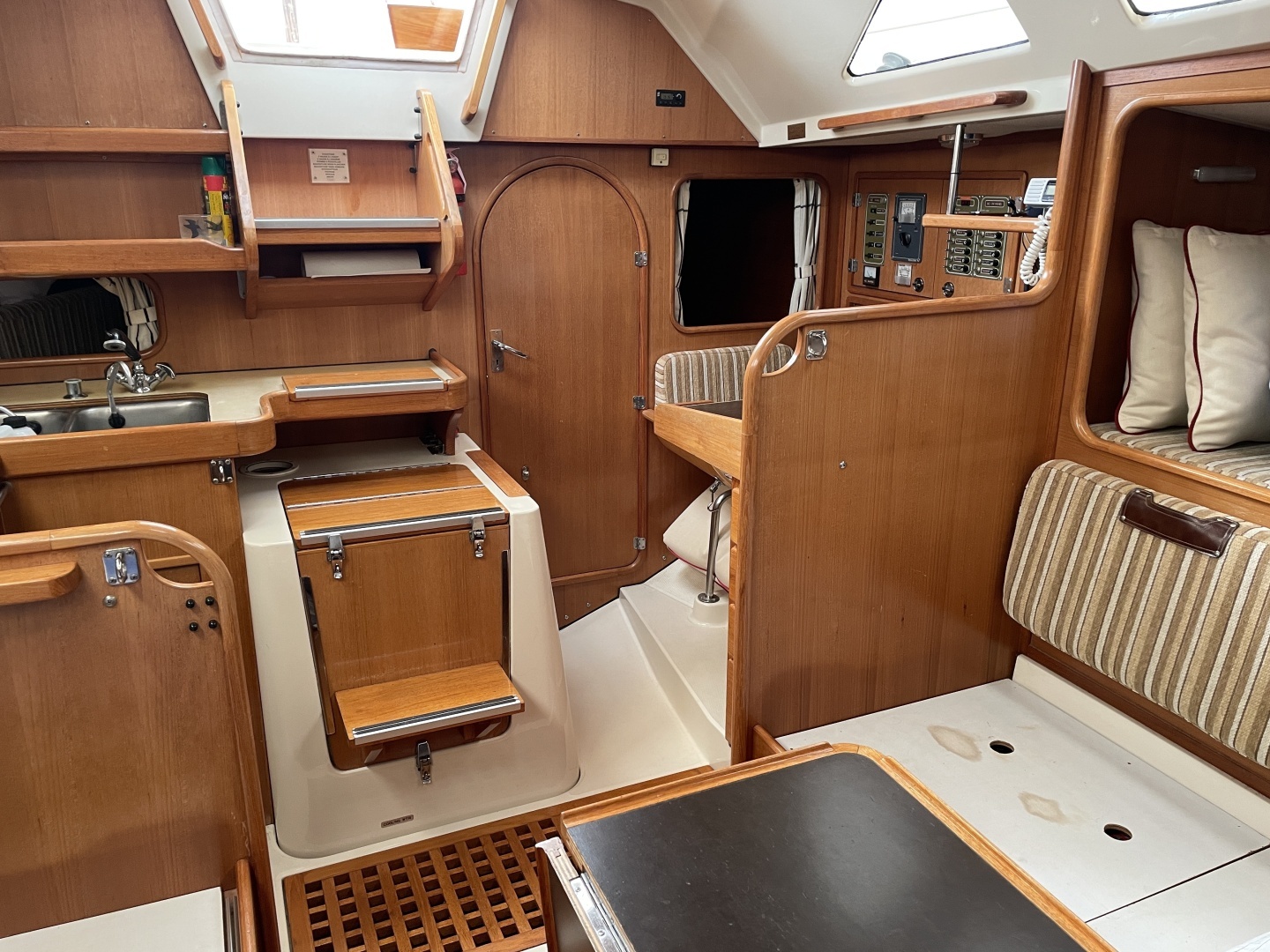 Forward stateroom with V Berth, overhead hatch, and privacy curtain. Head next aft to port with hanging locker opposite. Main cabin with padded port and starboard settees. Custom teak centerline table. Galley aft to starboard. Double aft cabin to port.
