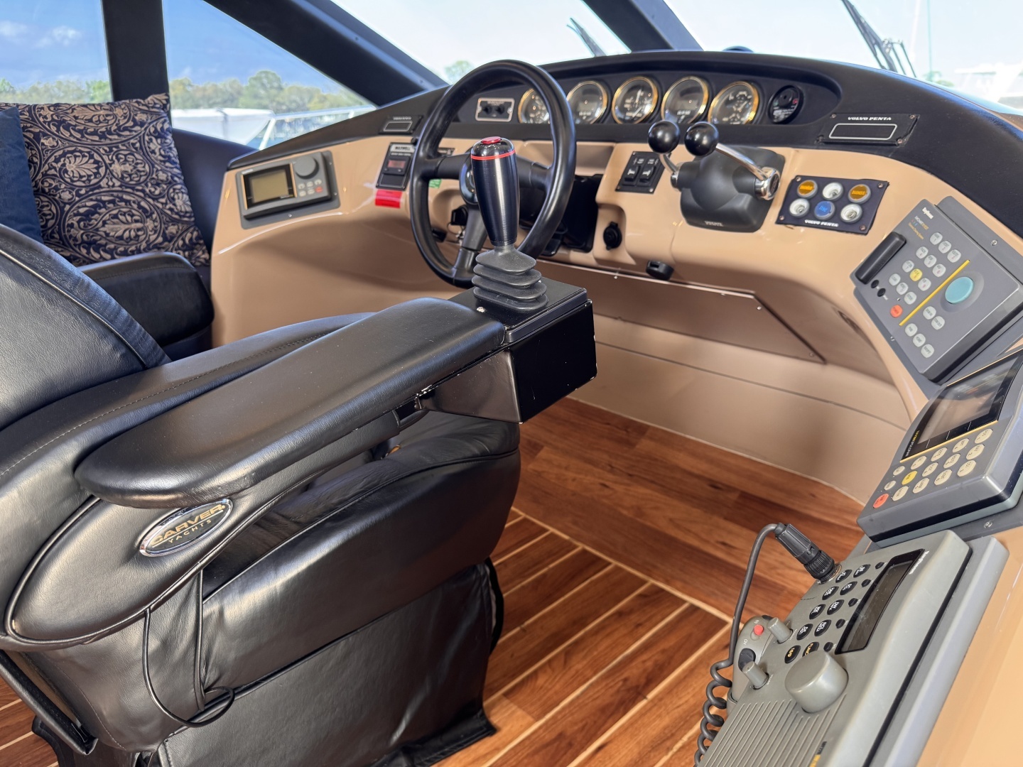 Positioned aft and accessed directly from the cockpit through a sliding glass door, the main salon is arranged to maximize usable space and natural light. Large side windows provide excellent visibility and contribute to the open feel of the interior. An L-shaped settee to starboard, along with additional seating, flat screen TV and bose surround sound system, creates a comfortable environment for relaxing or entertaining. The salon flows naturally into the galley and lower helm areas, supporting easy movement throughout the main deck.