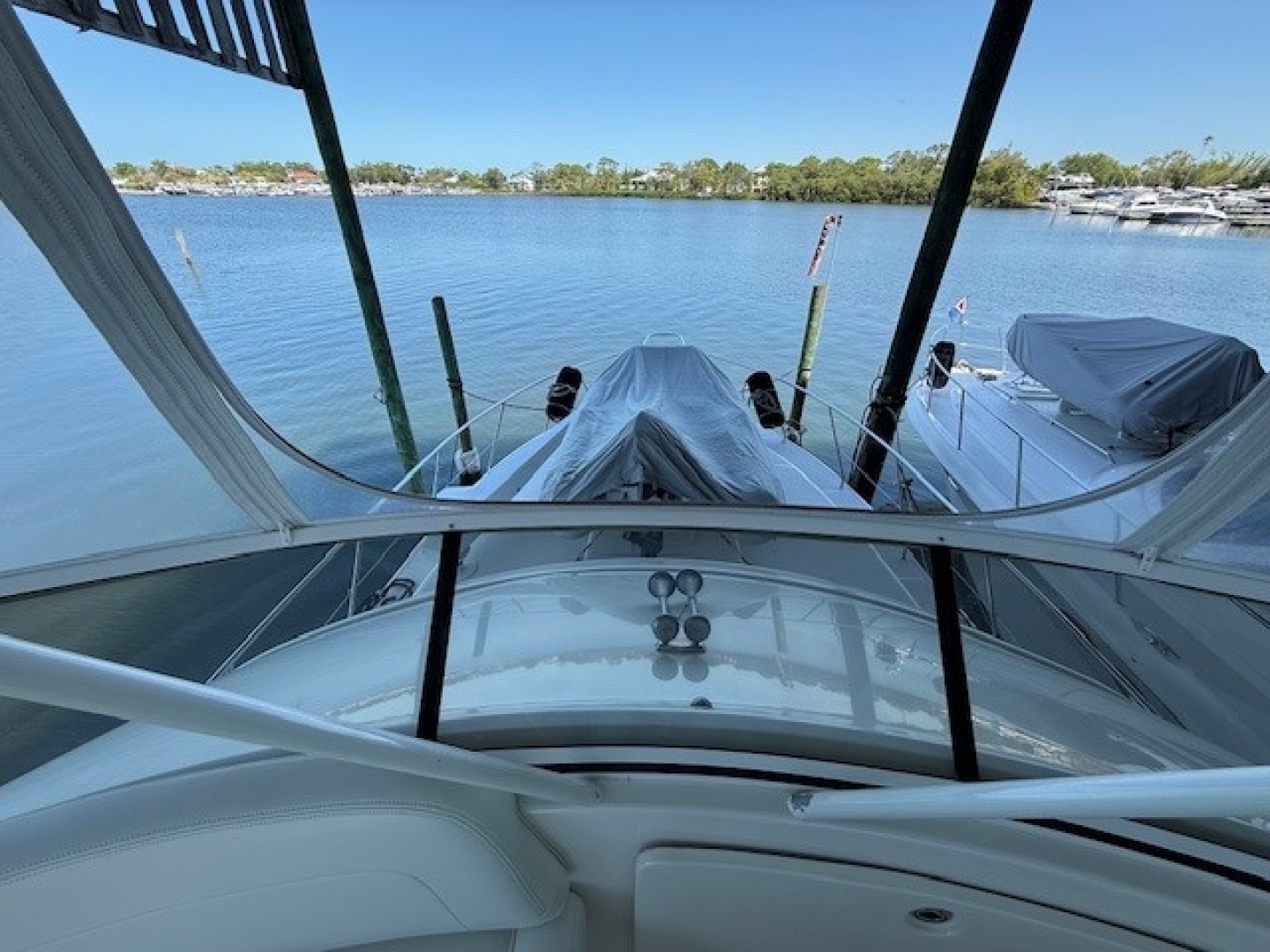 Four Reel has the factory hardtop with a full eisenglas enclosure.The well designed bridge offers a separate Captain and companion chair aft of the helm with plenty of guest seating forward of the helm console.It is well equipped with Garmin radar, Garmin GPS chartplotter/bottom sounder and Simrad autopilot.There is a Fusion stereo at the helm as well.Access to the bridge is from the cockpit via molded fiberglass steps which are much easier to use than traditional ladders found on most convertible vessels.
