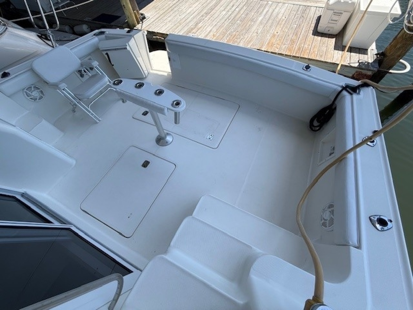 The cockpit is very large for entertaining or fishing activities and has a large transom door located on the starboard side for easy access to the swim platform on the transom.A hot/cold shower is located in the cockpit next to the transom door.There is a removable rocket launcher/rod holder in the center of the cockpit and tackle drawers and sink are located forward on the starboard side of the cockpit.There are rod holders located in the gunnels and overhead on the aft bridge railing. The 50 amp shorepower cord is located on the port side and has an electric Glendenning Cablemaster system.There is a large access hatch in the aft portion of the cockpit that has a lift out storage bin with direct access to the lazarette beneath.Another hatch located forward in the cockpit offers direct access to the engine room and the lazarette.Molded in fiberglass steps port and starboard lead to the wide non-skid sidedecks offering passage forward to the bow.