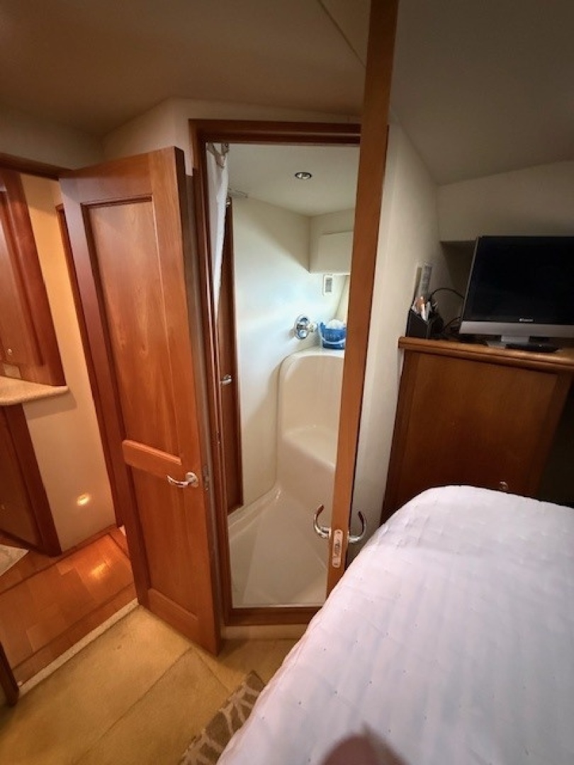 The master stateroom is located all the way forward in the companionway and has a centerline tapered queen bed with hanging lockers port and starboard and drawer storage under the bed.This room is carpeted and has direct access to the head compartment located to starboard and the separate shower compartment located to port.