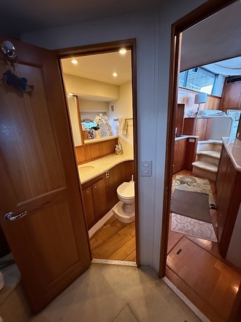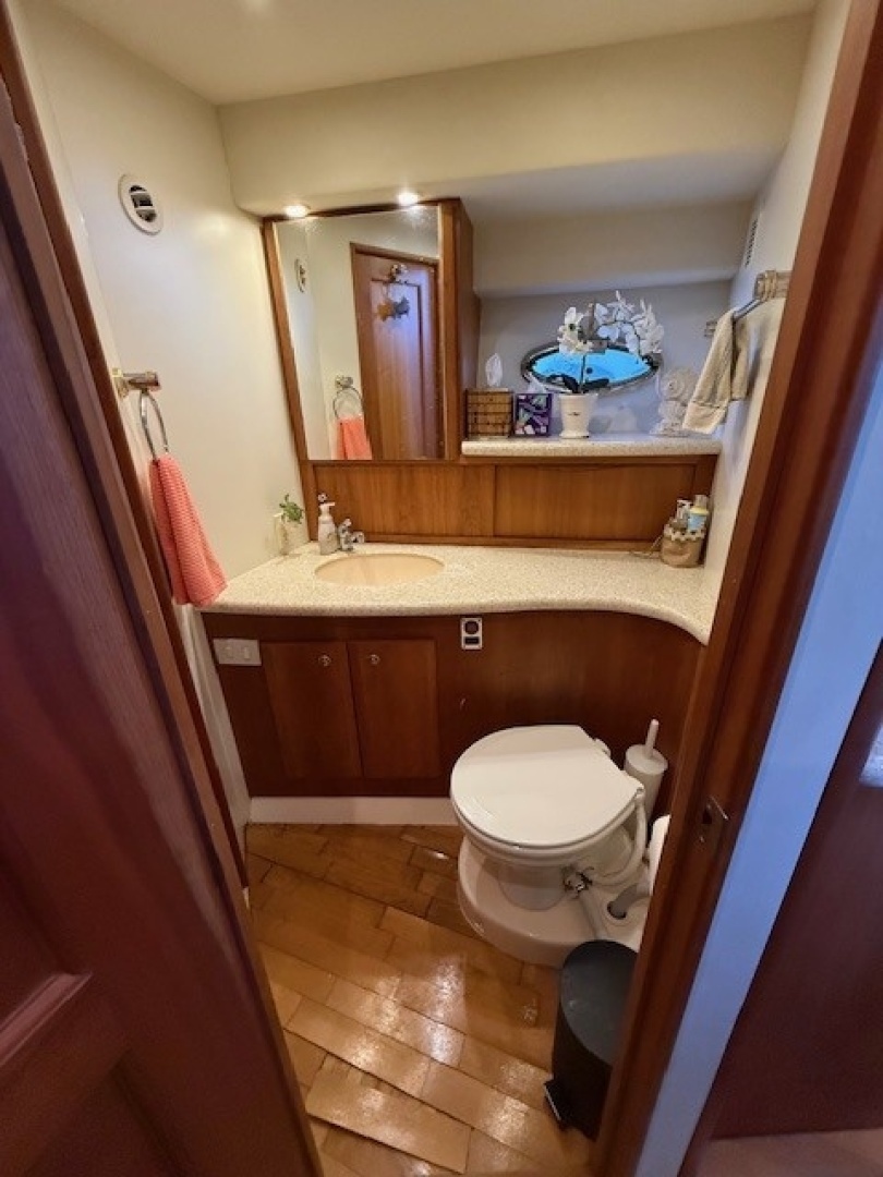 This vessel offers the split head/shower layout.The head portion is located on the starboard side forward of the galley.The shower portion is located on the port side forward of the guest stateroom.The head has access directly from the companionway and the master stateroom.The shower compartment has direct access from the master stateroom and the guest stateroom.Notable features: