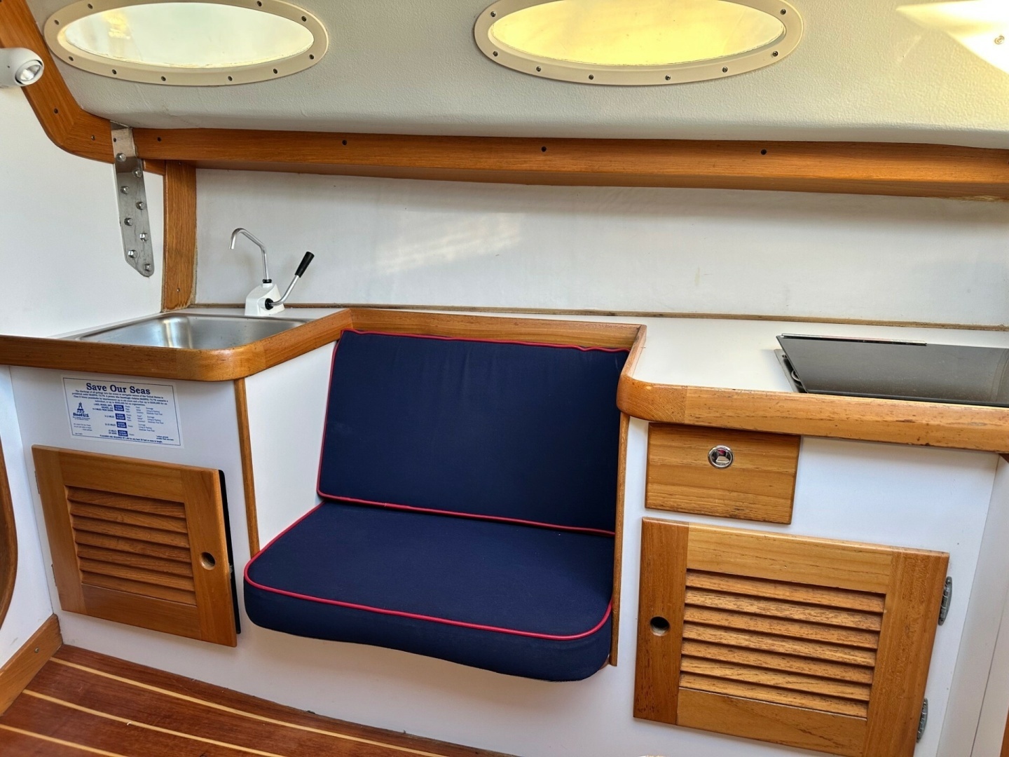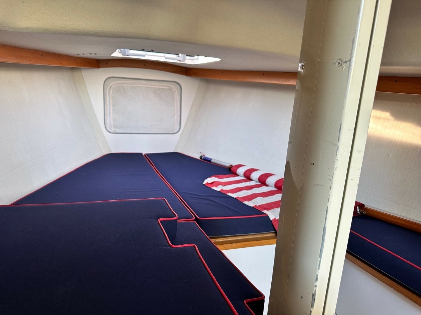Blue Sunbrella cushions with red piping, there are 4 fixed ports with 1 over head opening hatch for light and ventilation.