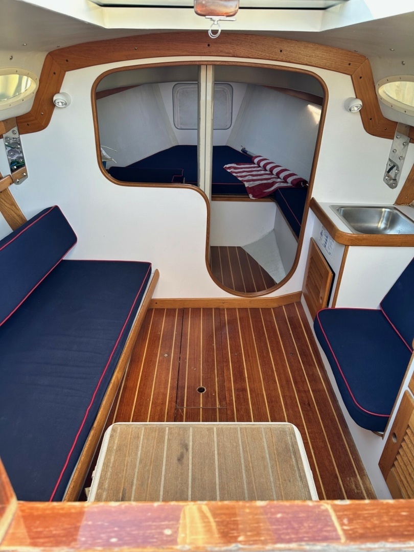 Built by the renowned TPI Composites (Tillotson-Pearson) in Warren, Rhode Island, using advanced SCRIMP resin infusion technology, the Alerion 28 delivers exceptional strength, efficiency, and sailing performance. Her modern underbody, featuring a fin keel and spade rudder, ensures outstanding stability and maneuverability, while the self-tacking Hoyt jib boom allows for effortless singlehanded sailing and impressive off-wind speed. A Volvo-Penta inboard diesel with saildrive provides reliable auxiliary power, making her as practical as she is beautiful.