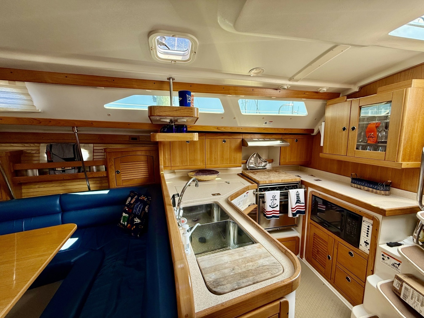 A center-line companionway features easy-to-navigate stairs flanked by dual handrails for added safety at sea. To starboard, the galley is equipped with a double-gimbaled propane stove and oven, a microwave, a deep double stainless-steel sink, and an exceptional amount of storage.