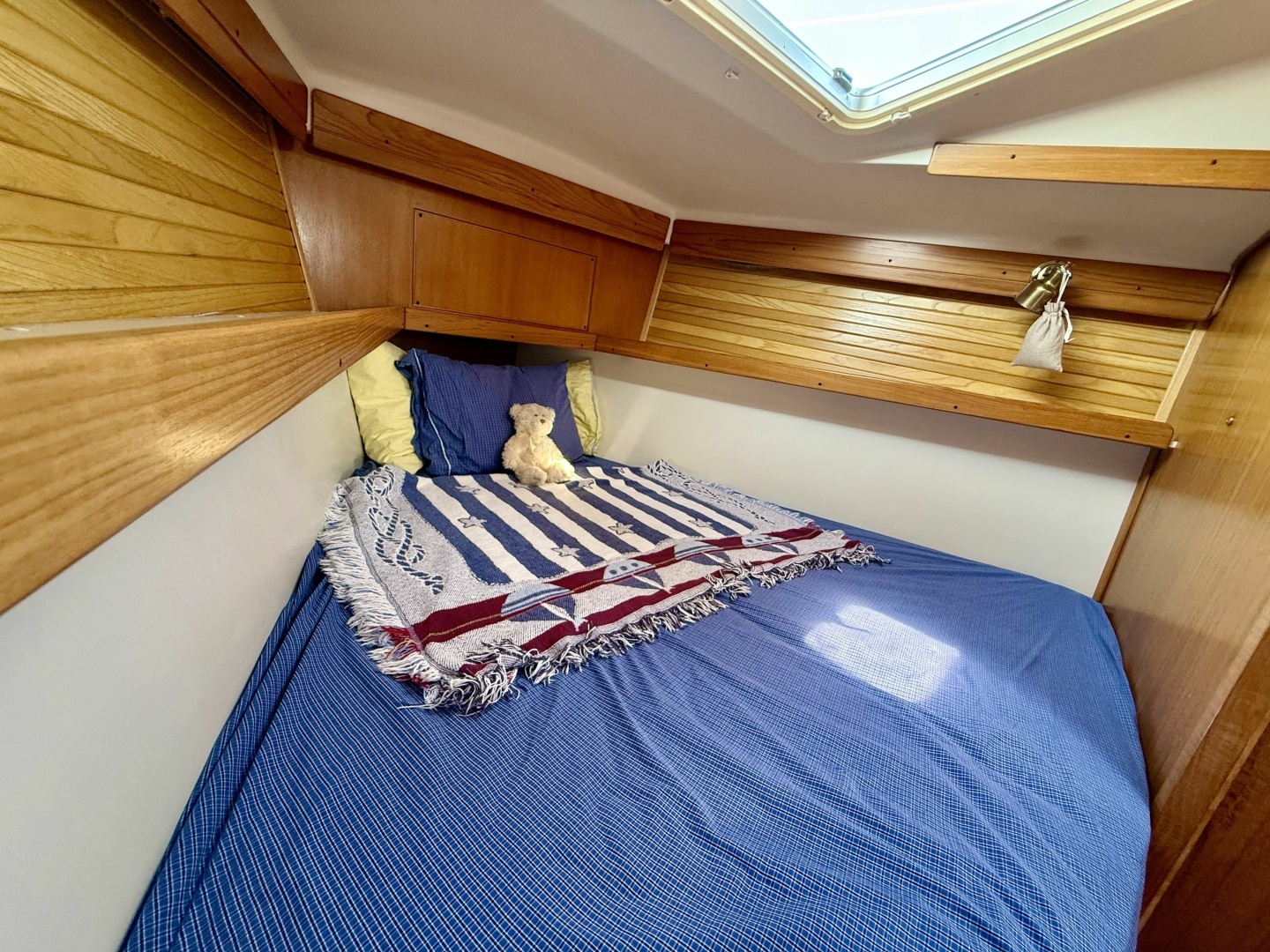 The forward guest cabin offers a private retreat, featuring adouble V-berth and anensuite wet head.With its cozy atmosphere and generous storage, it is perfectly appointed for long-range cruising in total comfort.
