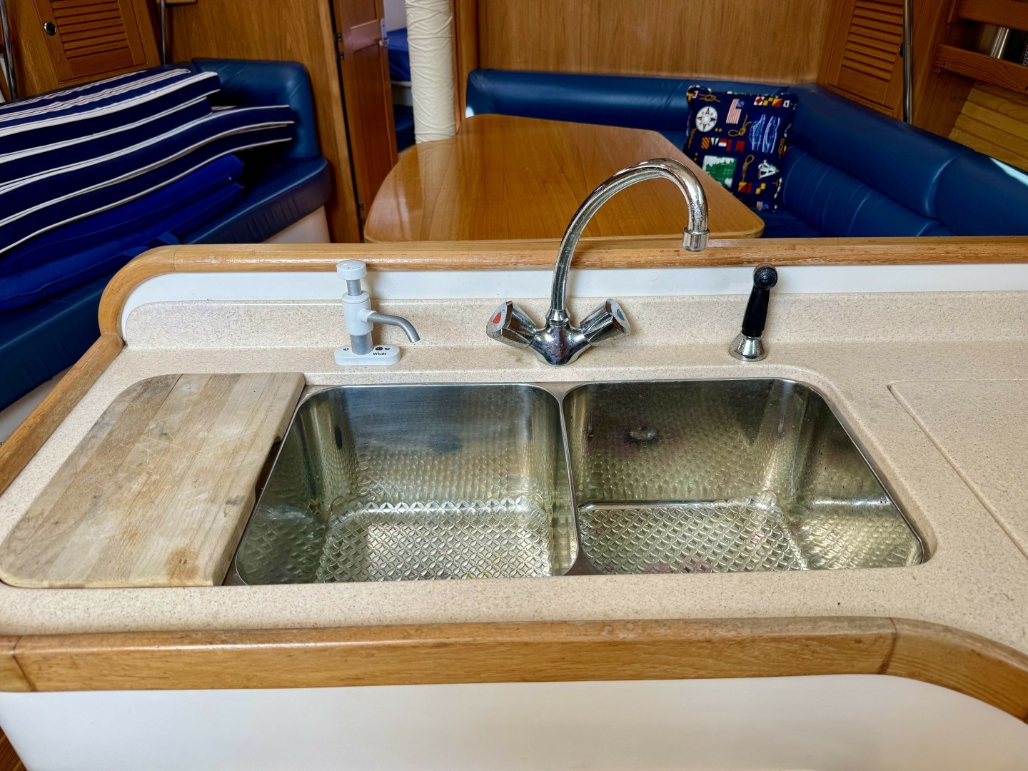 The galley is fully equipped for extended cruising, featuring aPrincess triple-burner gimbaled propane stove and oven, a microwave, and deep double stainless-steel sinks. It offers exceptional utility with a front-opening refrigerator and massive storage capacity. 3 Burner Princess stove / oven combo with exhaust fan