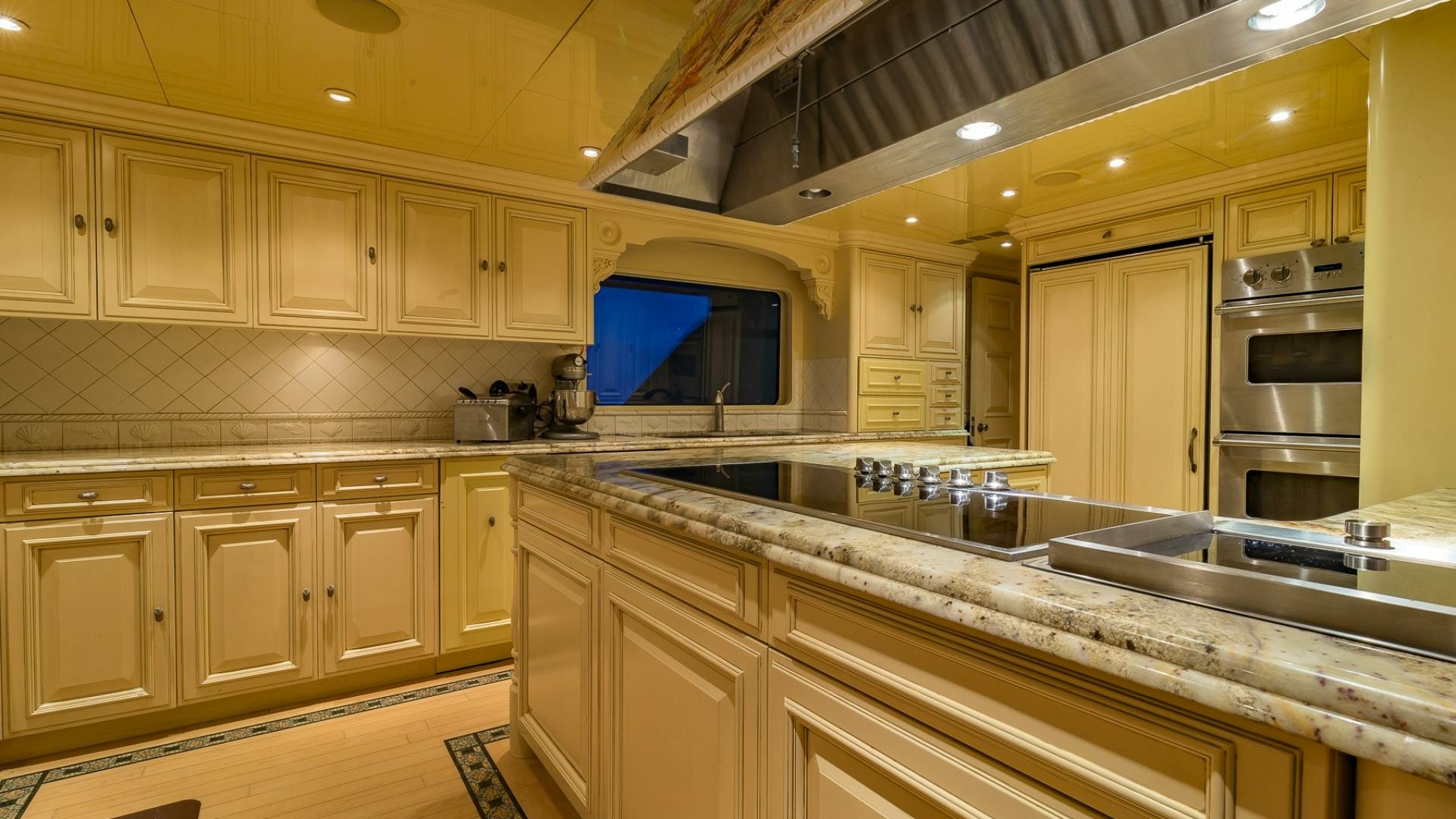 A custom painting situated between the galley and dining area can be lowered to reveal a glass window, offering the flexibility of viewing into the galley or closing it off for privacy during meals.