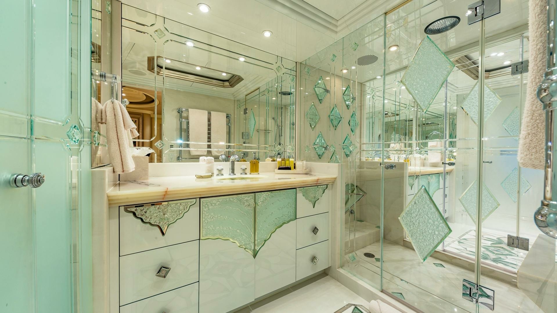 - Just forward of the sky lounge is a day head featuring a glass sink, marble flooring, and etched glass accents.