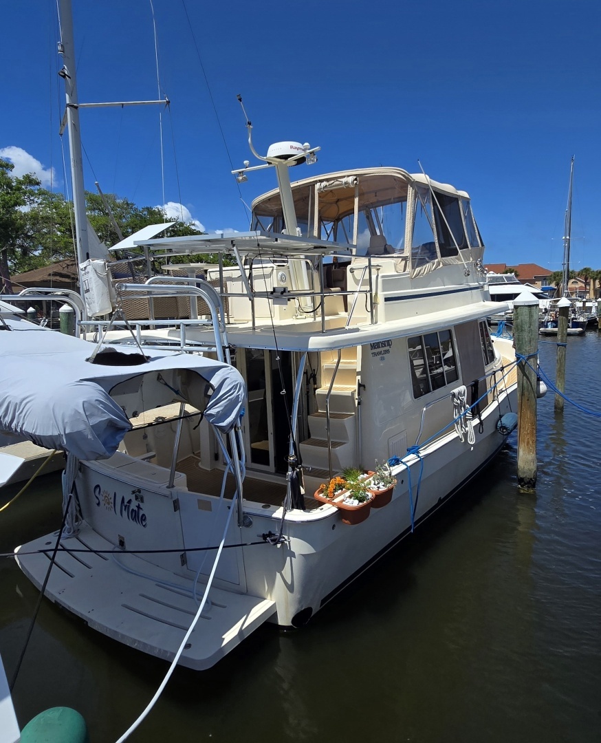Sol Mate is a 2005 40' Mainship 400 trawler. She offers a single Yanmar 370 HP main engine, Kohler 8 kW generator, Side-Power bow and stern thrusters, oil change system, isolation transformer/booster, solar panels, 2016 West Marine RIB tender with a Torqueedo electric outboard, molded-in steps to the flybridge and a two stateroom layout. Sol Mate features several recent cosmetic and functional upgrades including a new LoveSac couch, new LED lighting sconces in the salon, new Oceanair blinds, 2 new TV's and much more. Some of the more functional upgrades include screens added to the flybridge enclosure, additional cleats, a new reverse osmosis water system and a Starlink receiver.