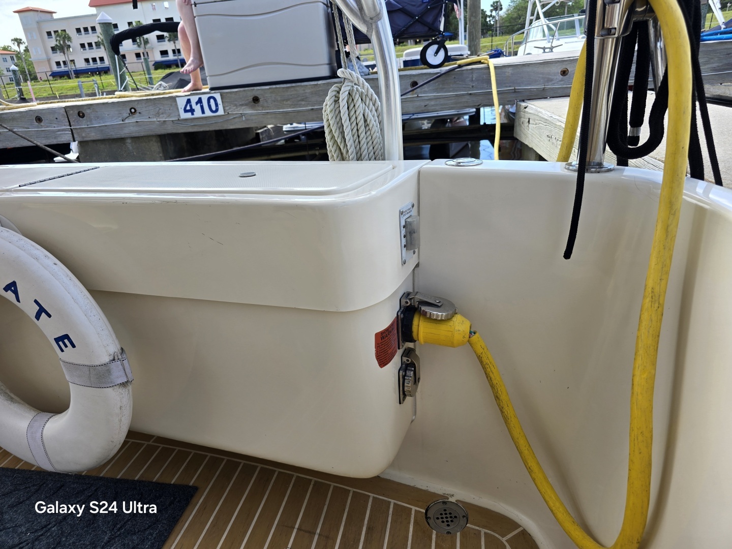 The guest stateroom is to port and offers one single berth with storage underneath, reading light, fan, vinyl teak & holly sole, portlight (new seal in 2024), overhead hatch with a screen/shade, removable clothes hanging rods, hanging locker and storage cabinets. The head with an enclosed shower is to starboard.