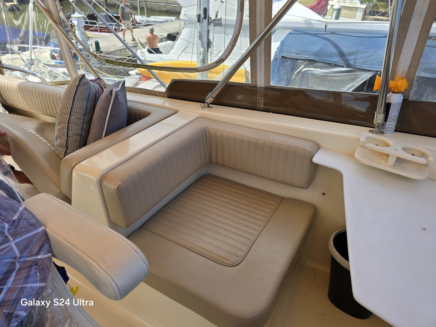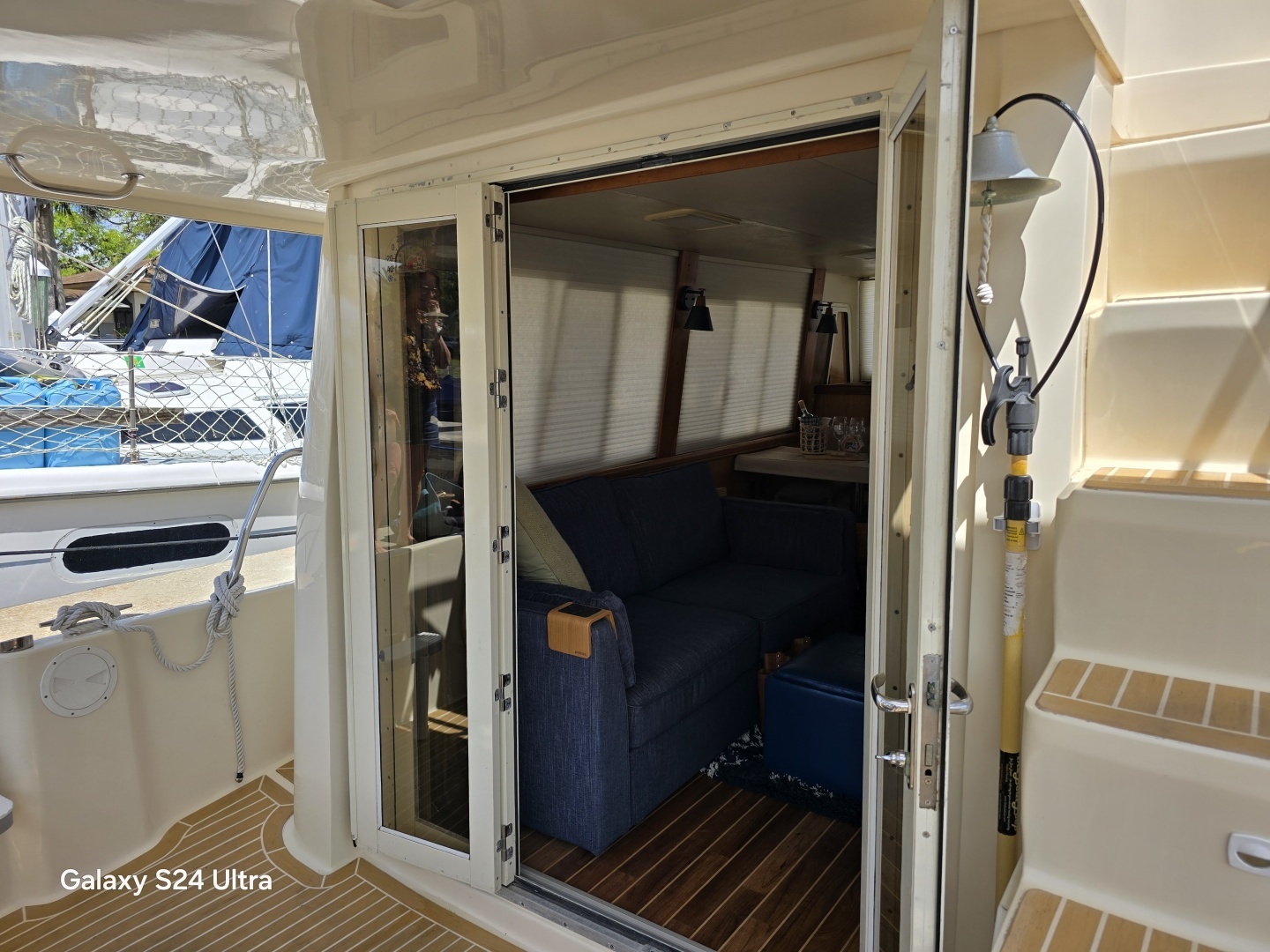 The salon offers a LoveSac couch with storage, ottoman with storage and an end table with liquor bottle/glass storage to port, dinette and two stools port forward, side deck access door starboard forward, vinyl teak & holly sole, opening side windows with screens and blinds, double aluminum & glass doors with a curtain aft, screen door aft, shades on the windshield, opening center windshield and engine room access.
