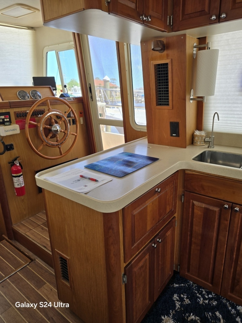 From the fiberglass swim platform, you enter the hardtop covered aftdeck via the starboard transom gate. Once on the aftdeck, you will find molded-in steps to the flybridge, same level side decks and double aluminum & glass doors to the salon. Once inside the salon, you will find the electrical panels and galley to starboard, lower helm and side deck access door starboard forward, a LoveSac couch to port and a dinette port forward. Step down the companionway and you will find a guest stateroom to port, master stateroom forward and a head with enclosed shower to starboard. Engine room access is via salon sole hatches with hinges.