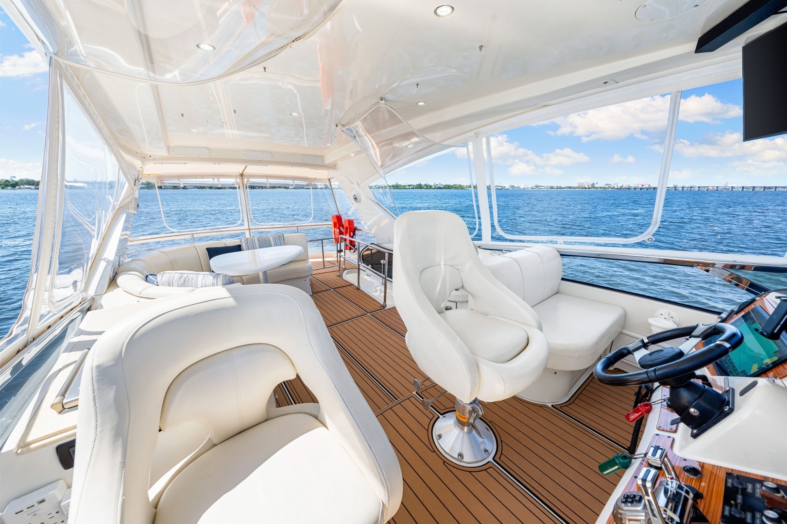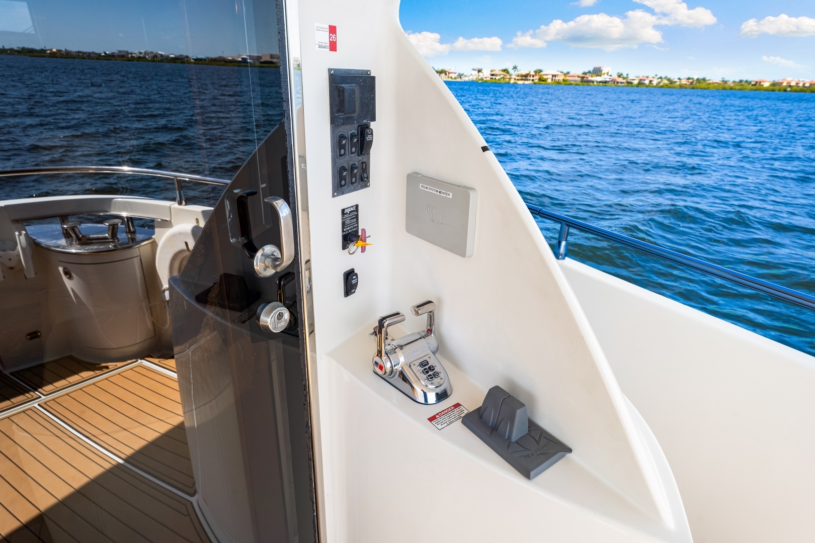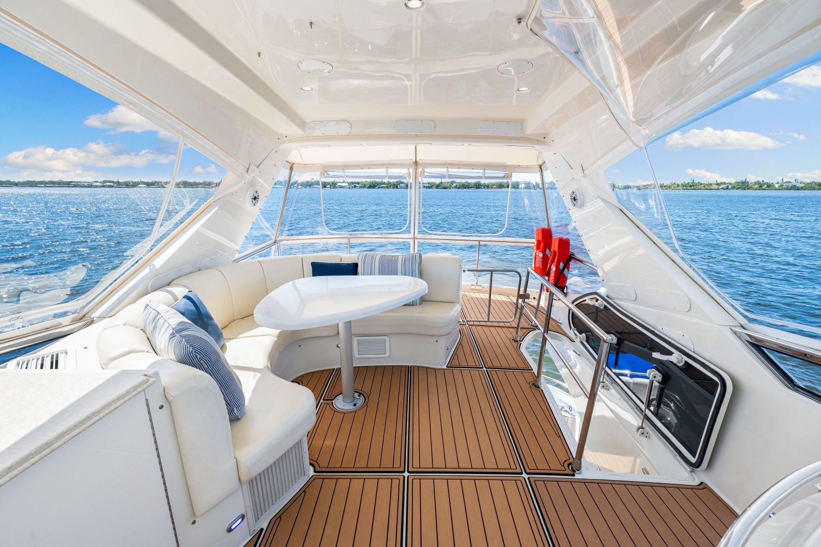 - Spacious cockpit with sea deck flooring cockpit shower, and table