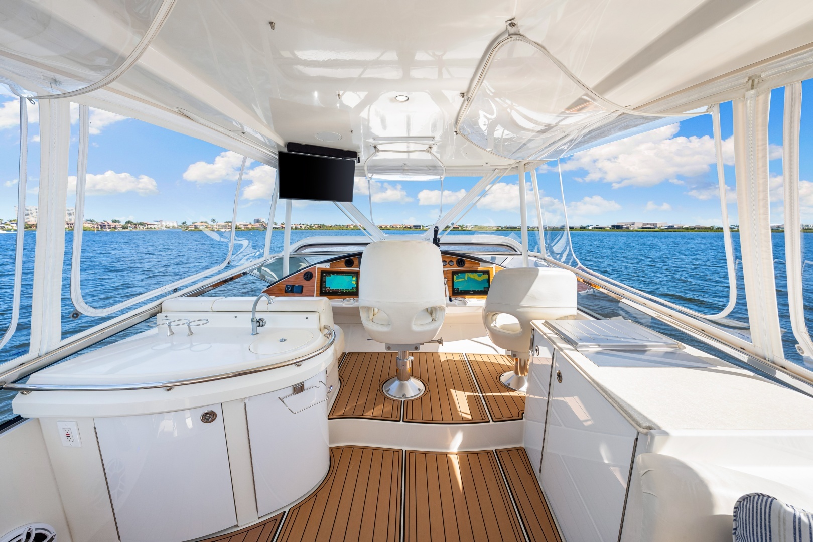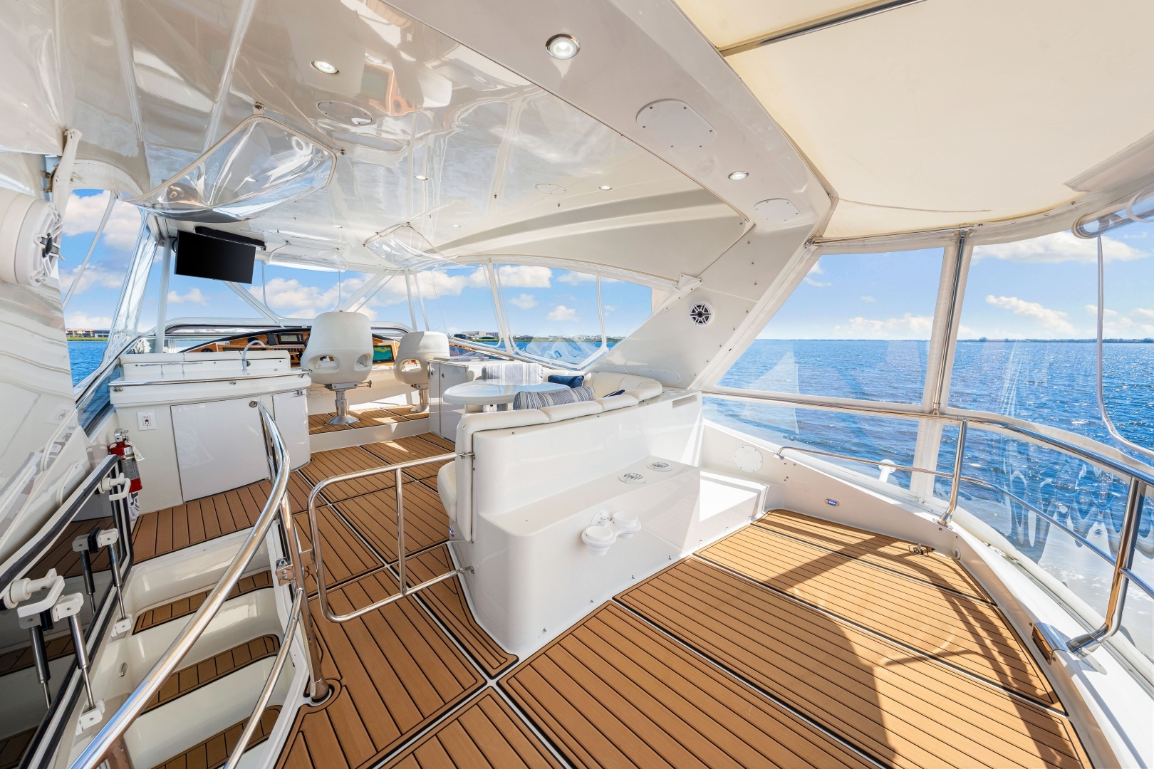 - Expansive flybridge with hardtop, helm station, seating, grill, fridge/freezer, and ice maker