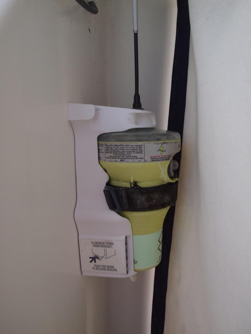 - 10-person Viking life raft — remounted in stainless steel cradle behind helm (note: certification expired January 2024; recertification recommended prior to offshore passages)