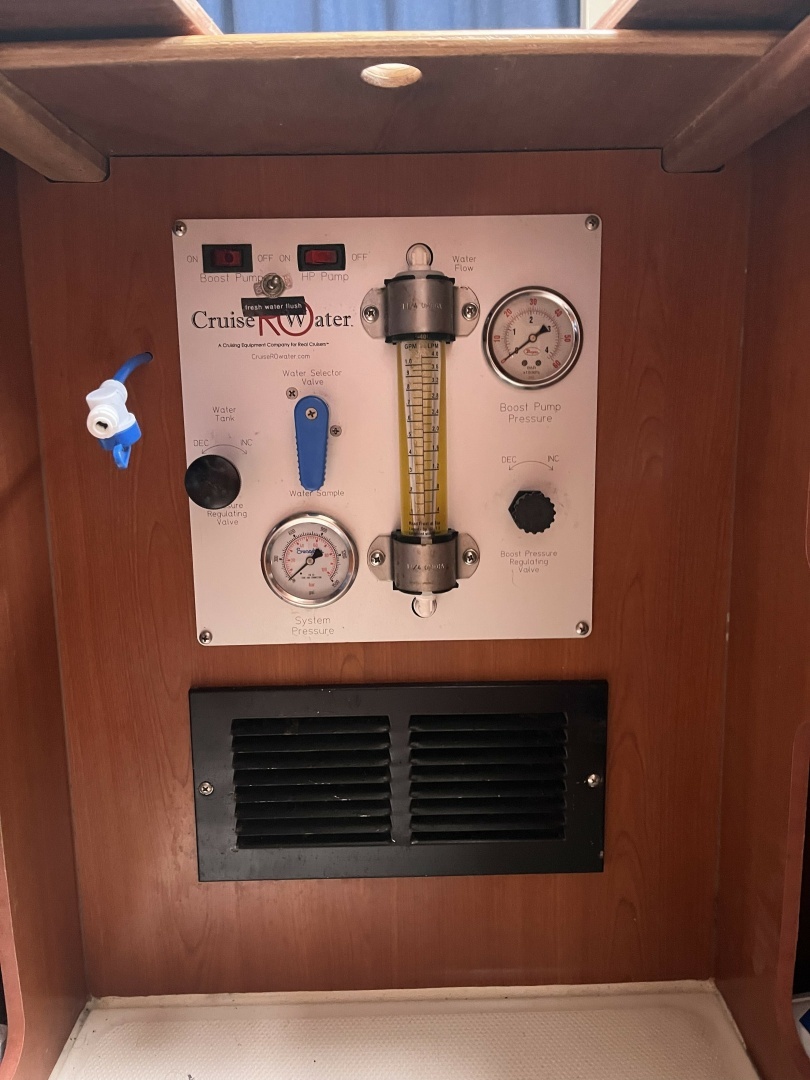 - Watermaker: Cruise RO 42 gal/hr with spare membranes aboard