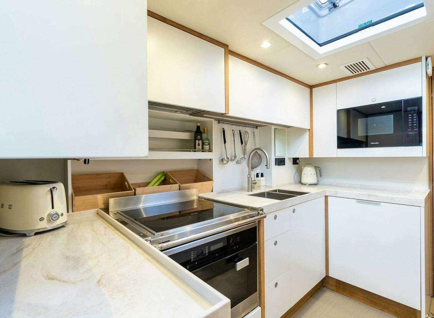 Inside, her modern, fresh interior features wraparound deck saloon windows that provide panoramic views. The salon is finished in fine wood tones and light cream fabrics. The port-side dining area comfortably seats eight, while the forward-facing navigation station to starboard is ideally positioned for easy access to controls. The fully equipped galley features white-grey marble countertops, a Miele induction hob and electric oven, and top-tier appliances, ensuring effortless meal preparation whether at anchor or underway.