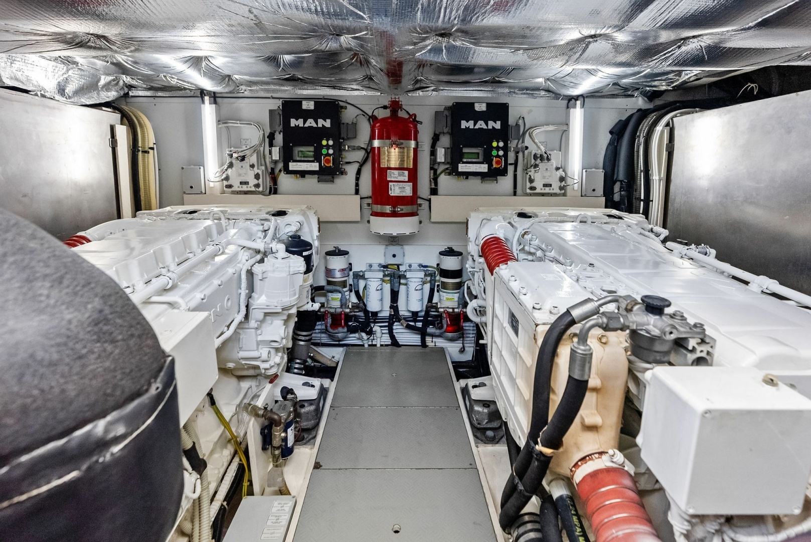 - Access to the engine room through a hatch and a stainless steel and teak ladder