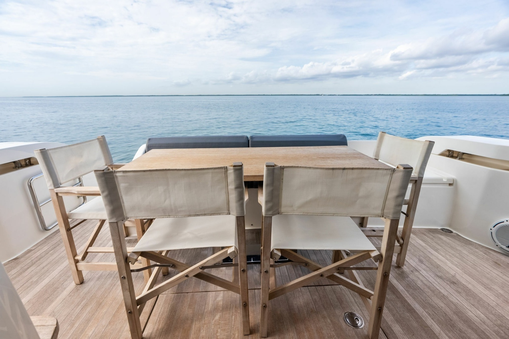 - Access to the flybridge through stainless steel and teak steps, stainless steel handrail
