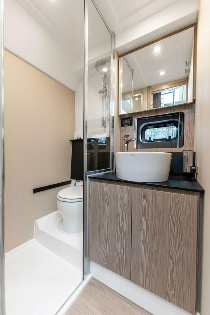Well-organized living spaces create a liberating dynamic on the main deck, while spacious interiors evoke an airy, lively mood. Versatile design adaptions cater to diverse lifestyle demands, as the contrasting synergy of materials, from matte to glossy details, inspires a neat sense of style.
