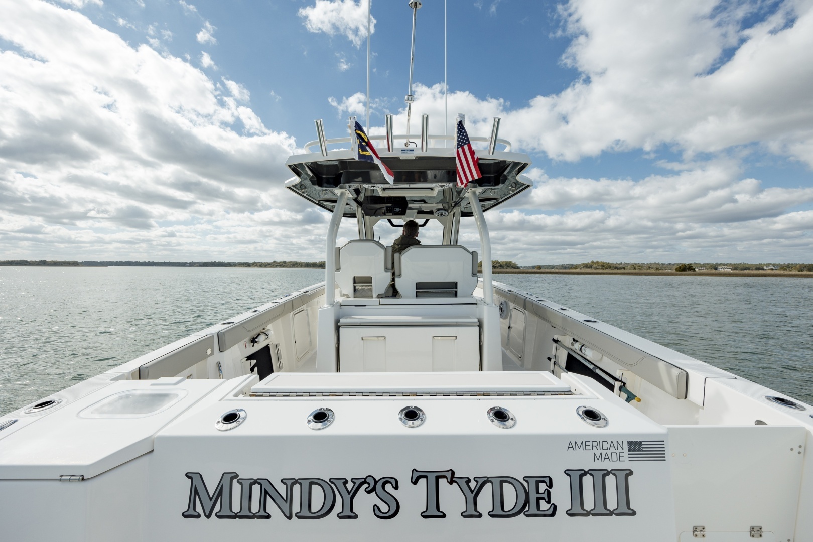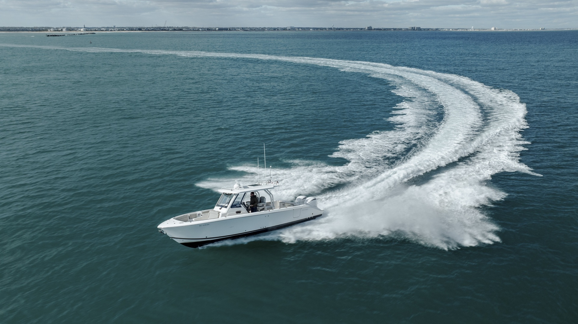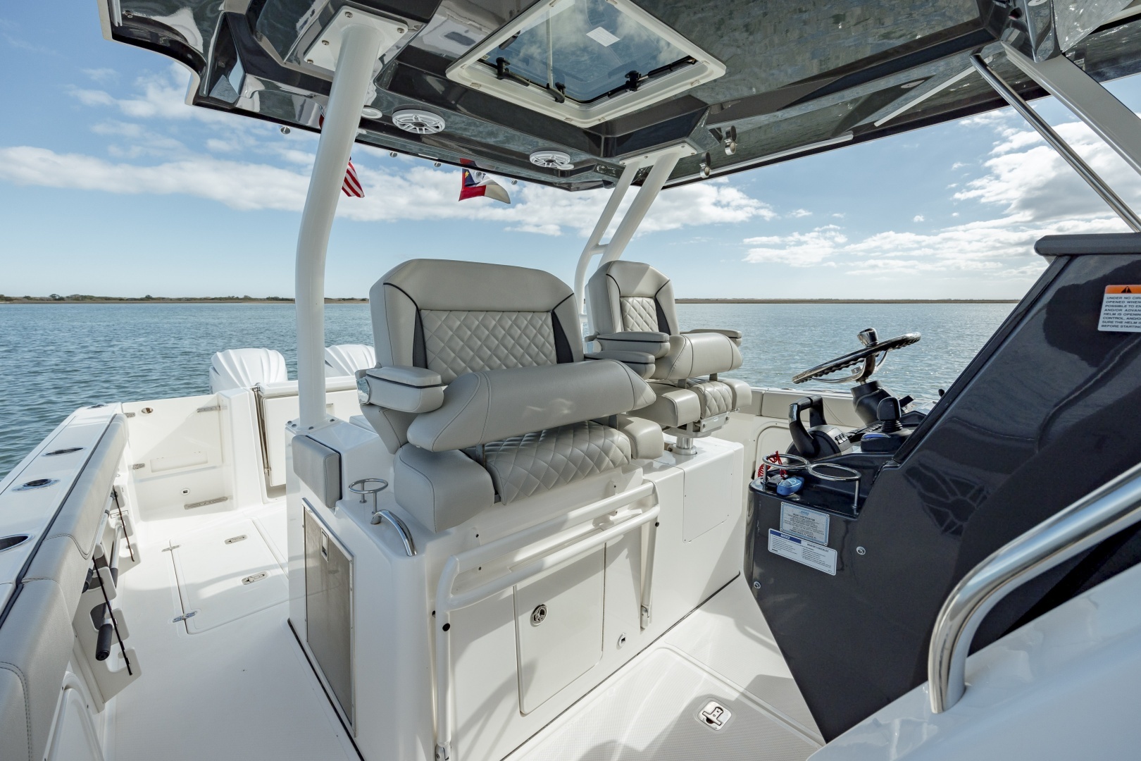 The athletic 32 features an oversized fiberglass integrated hardtop and windshield system, updated classic sheerline, through-stem anchor system and integrated transom extensions.