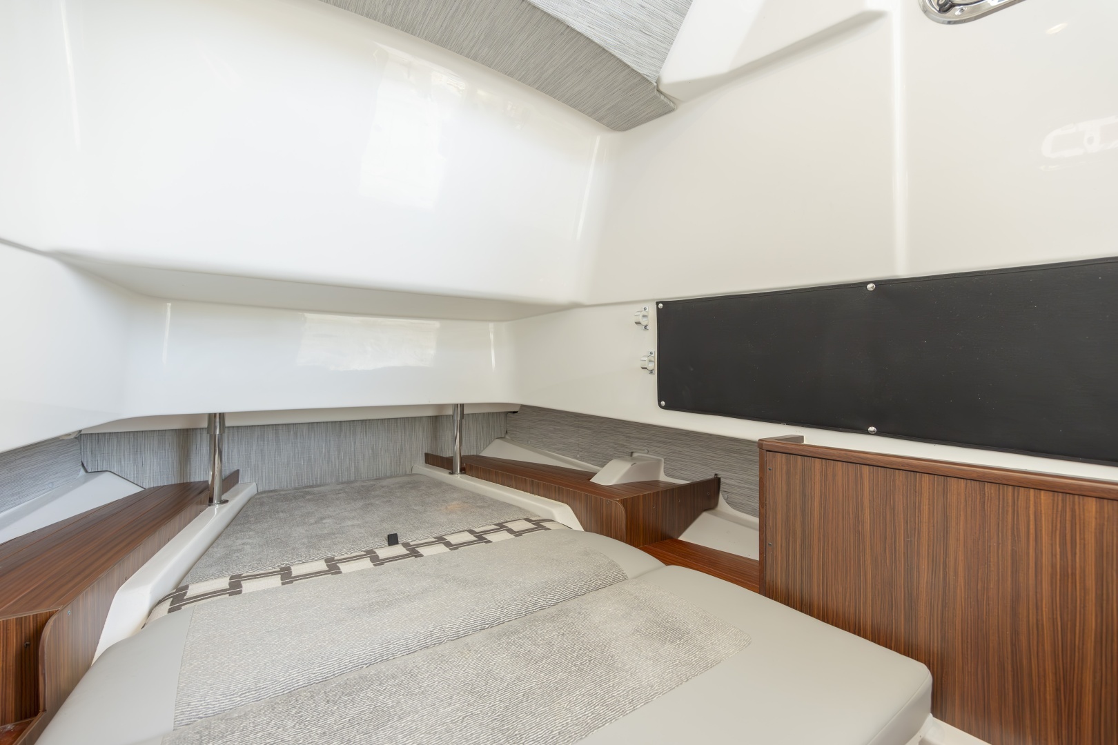 Below, a two-person berth converts to an aft-facing seat with large open storage areas port and starboard. A head and sink with vanity could let you overnight and freshen up for a dinner shore side. The aft-facing cockpit accommodates serious fishing and with the fold away fore and aft seats, quickly converts to a social area at the dock.